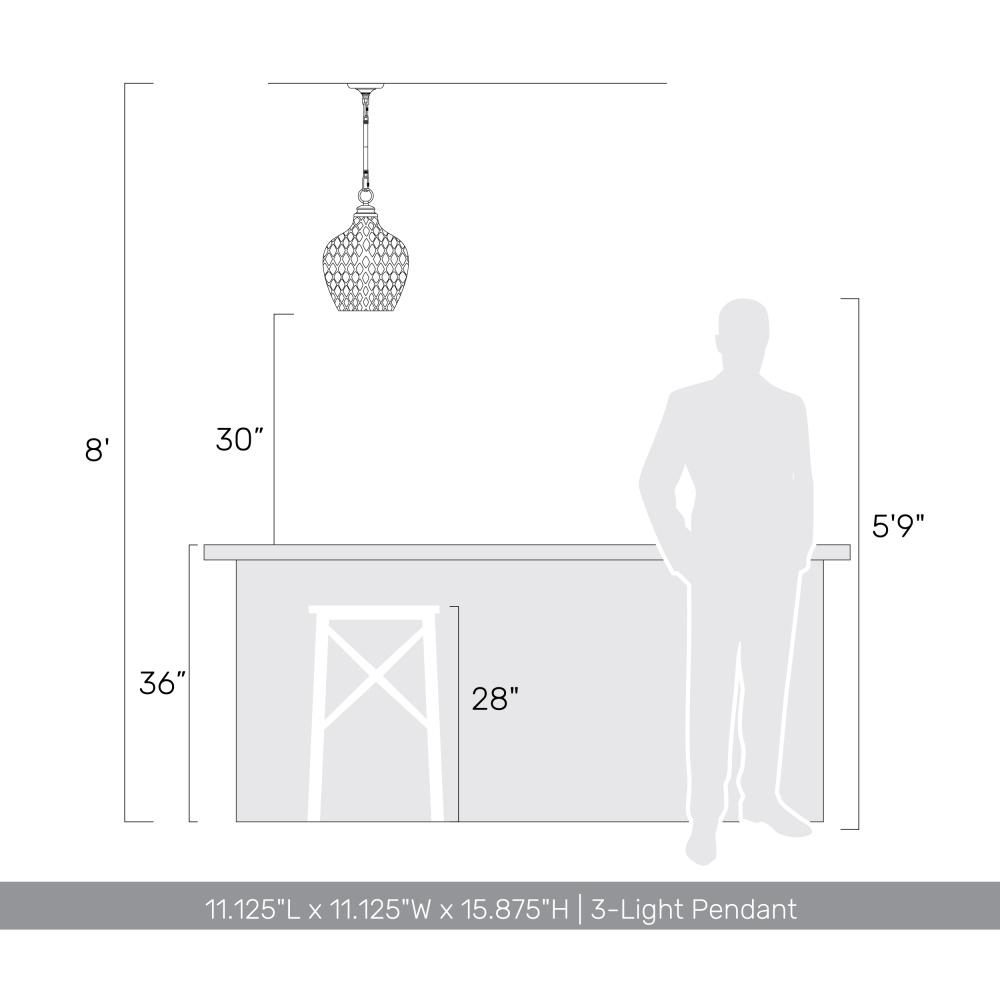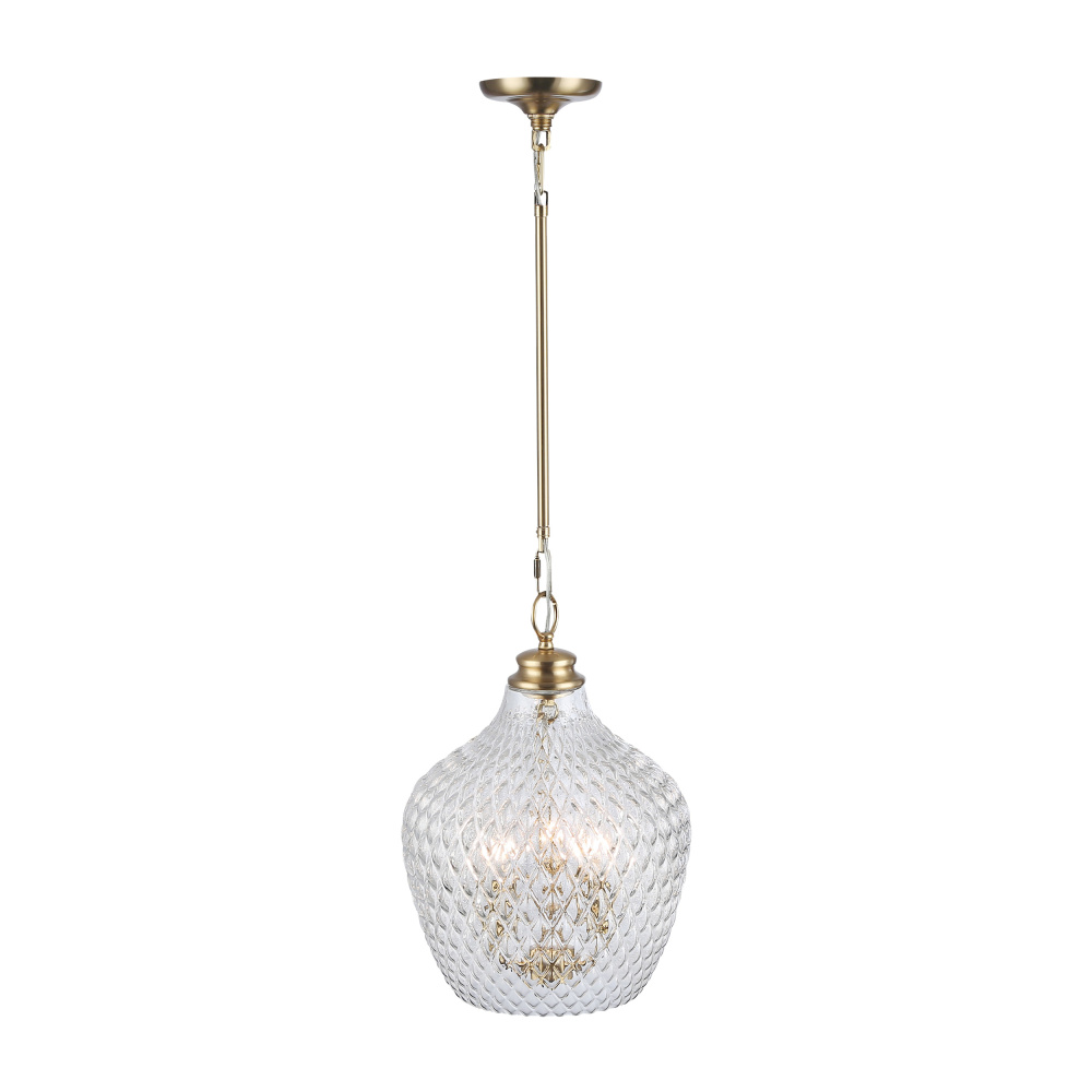Bring cozy farmhouse elegance into your home with the Golden Lighting Adeline 3-light Pendant. Featuring a glass shade and a Modern Brushed Gold frame, it creates a welcoming atmosphere. The clear glass shade provides brilliant, unobstructed light. With a smooth, polished finish, this glass shade complements a variety of styles while allowing the beauty of the bulb and the fixture's design to take center stage. Our Modern Brushed Gold finish offers a radiant warmth and a luxe, contemporary appeal. Treated with a fine brushing for a sophisticated surface, it beautifully diffuses light for a soft, inviting glow. Ideal for kitchens, dining rooms, or bedrooms, this pendant is perfect for focused yet decorative illumination in entryways and bathrooms. It is dry location rated and easily installs on sloped ceilings with an adjustable height of 29" to 63". Dimensions: 11.13"W x 15.88"H x 11.13"D. Requires 3 E12 Candelabra base bulbs (not included), with a maximum wattage of 60 per bulb. Elevate your space with warm, inviting light and meticulous craftsmanship that fits beautifully into your decor.