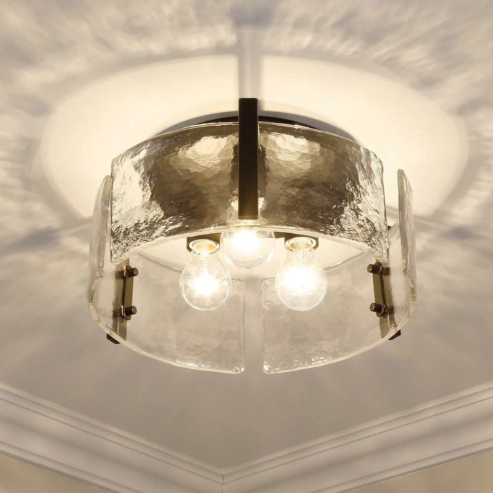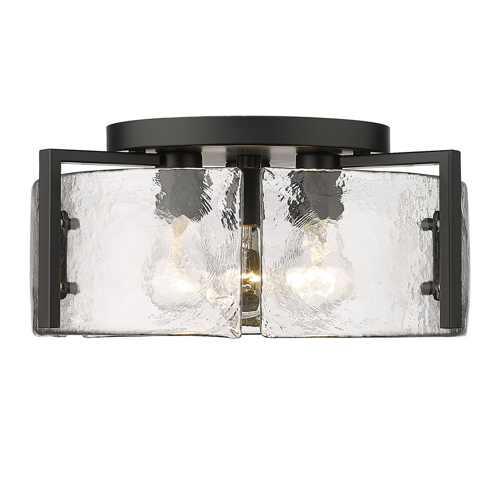 Bring nature-inspired elegance into your home with the Golden Lighting Aenon 3-light Flush Mount. Featuring a glass shade and a matte black frame, it creates a welcoming atmosphere. The glass shade showcases a hammered water glass design, featuring a heavy, irregular texture crafted to create beautifully distorted and refractive light effects that mimic the essence of natural elements. The matte black finish provides an understated elegance, perfect for complementing various décor styles from minimalist to bold contemporary. Ideal for low ceilings in hallways, closets, laundry areas, and bathrooms, this fixture is damp location rated for covered and semi-enclosed spaces with occasional moisture. It requires 3 E26 medium base bulbs (not included), with a maximum wattage of 60 per bulb. Overall Dimensions: 15"W x 6.88"H x 15"D. Elevate your space with the quality craftsmanship and artistic details of this versatile flush mount light.