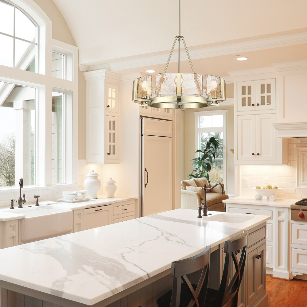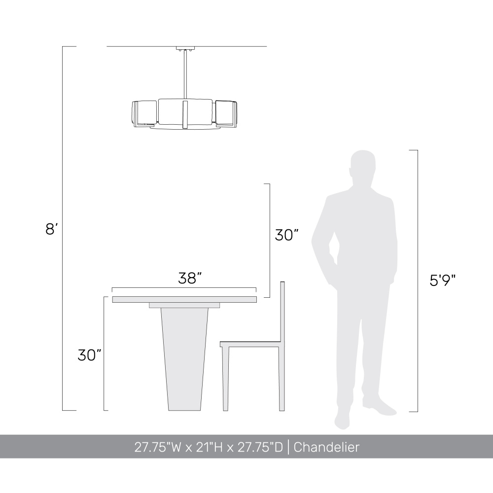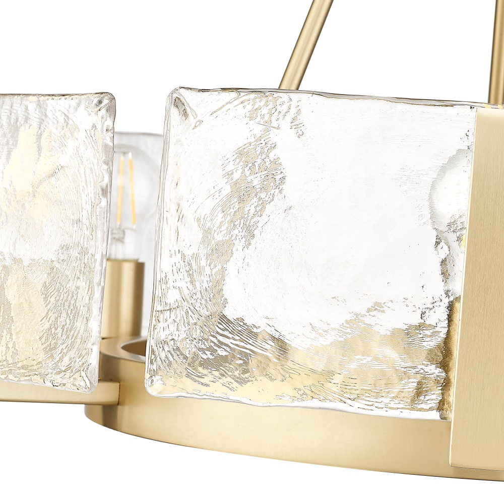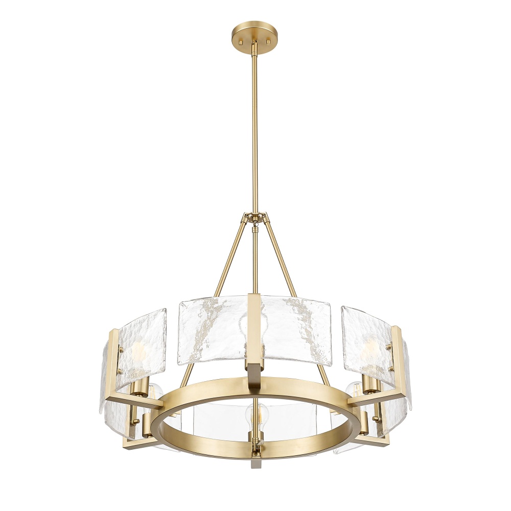 Bring nature-inspired elegance into your home with the Golden Lighting Aenon 6-light Chandelier. Featuring a glass shade and a brushed champagne brass frame, it radiates sophistication and warmth. The hammered water glass shade captures the beauty of ice and water, refracting light to create a dazzling glow that elevates your interior. The brushed champagne brass finish blends the warmth of brass with the softness of silver, creating a chic and versatile aesthetic. This chandelier is suitable for covered and semi-enclosed spaces with occasional moisture, making it ideal for dining rooms, foyers, and living areas. Its convertible design allows for installation as a semi-flush mount or pendant, adjustable from 23.625" to 65.625" in height. Overall dimensions are 27.75"W x 21"H x 27.75"D, and it requires 6 E26 medium base bulbs (not included, max 60 wattage per bulb). Make a bold statement with this artisanal piece that emphasizes quality and craftsmanship.