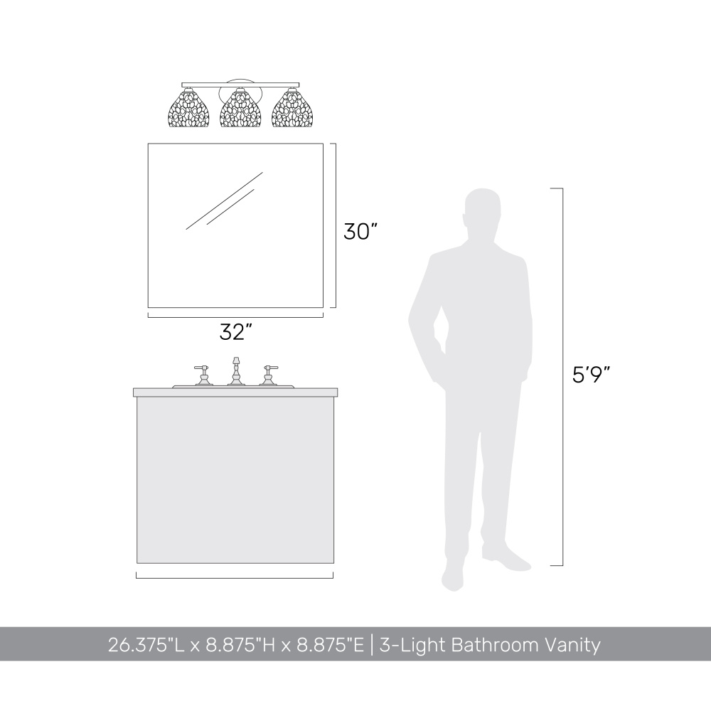 Bring Transitional elegance into your home with the Golden Lighting Ariella 3-light Vanity in Brushed Champagne Brass. Featuring a glass shade, it creates a welcoming atmosphere. The Hammered Clear Glass shade showcases a captivating texture that reflects light brilliantly. The sophisticated Brushed Champagne Brass finish provides a chic alternative to gold, ensuring a soft and warm ambiance. Rated for damp locations, the fixture is perfect for bathrooms or other moisture-prone areas. It requires 3 E26 Medium base bulbs (not included, max 60 watts per bulb), and its overall dimensions are 26.38"W x 8.88"H x 8.88"D. Discover a blend of elegance and quality with Golden Lighting.