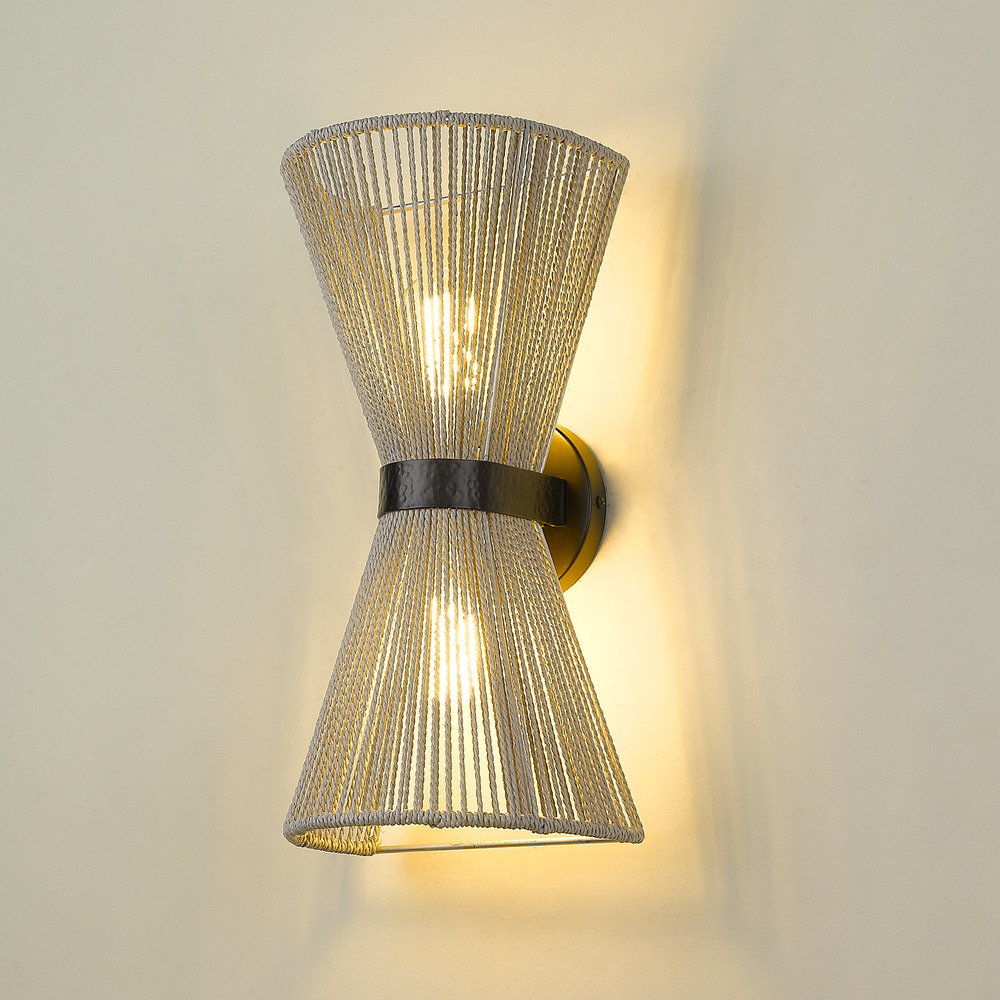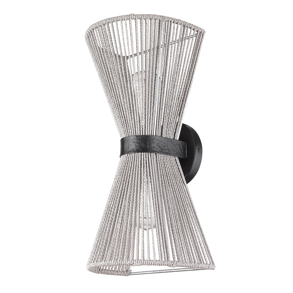 Bring boho elegance into your home with the Golden Lighting Avon 2-light Wall Sconce. Sporting a rope shade and a matte black frame, it creates a welcoming atmosphere. The bleached raffia shade is not only a stunning visual statement but also features a textured surface with an organic quality, adding a layer of warmth and relaxed elegance. This artisanal material contributes to a light diffusion that is both airy and structured. The matte black finish offers a clean, modern style, absorbing light to create a soft, sophisticated appearance that complements various decors. Perfect for enhancing hallways, stairways, or adding cozy ambiance in bedrooms and dining rooms, this fixture is damp location rated, well-suited for covered areas with occasional moisture. Overall Dimensions: 8.13"W x 16.63"H x 7.5"D. Requires 2 E26 Medium base bulbs (not included), max 60 wattage per bulb. Embrace quality craftsmanship with the Golden Lighting Avon 2-light Wall Sconce—your perfect choice for modern and eclectic spaces.