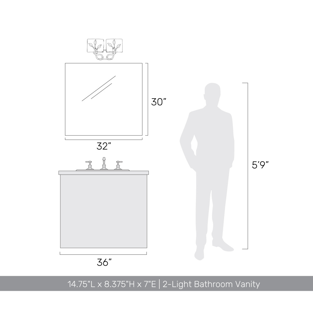 Bring nature-inspired elegance into your home with the Golden Lighting Calla 2-light Vanity in White Gold. Featuring a glass shade and a White Gold frame, it creates a welcoming atmosphere. This glass shade showcases hammered water glass, creating a beautifully distorted and refractive light effect that adds a characteristic glow. The White Gold finish, blending warmth with subtle sophistication, features a brushed texture, enhancing the charm of any space. Brighten up bathrooms with dedicated lighting that flatters while providing practical task illumination in damp locations like bathrooms and laundry rooms. Requires 2 E26 Medium base bulbs (not included) with a maximum of 60 watts each. Overall dimensions are 14.75"W x 8.38"H x 7"D. Infuse your bathroom with this timeless piece, highlighting quality and artistry.