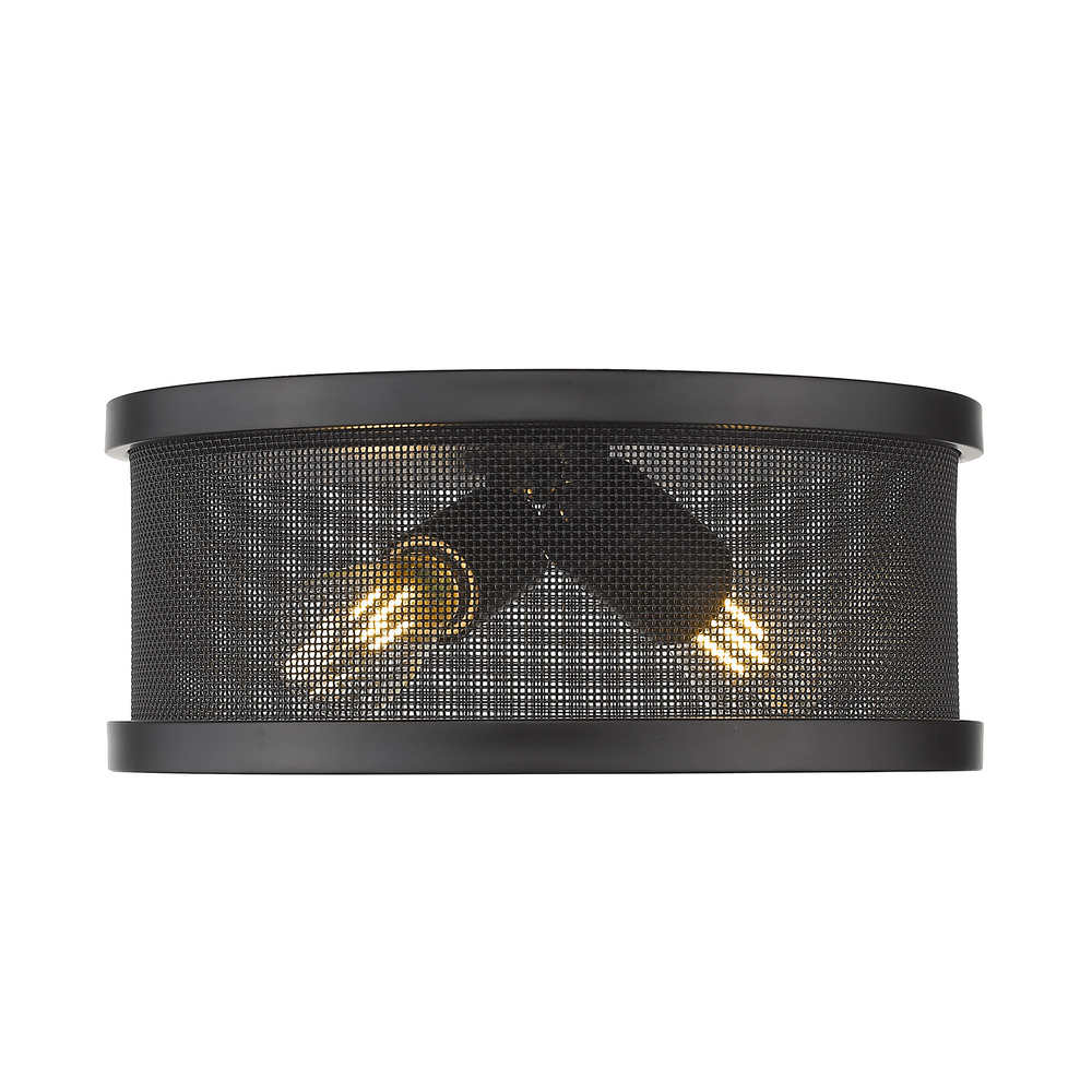 Infuse your space with contemporary style using the Golden Lighting Channing 2-light Flush Mount in Matte Black. This eye-catching design showcases a unique drum made of fine wire mesh, giving it a distinctive cage-like appearance without compromising illumination. The flush mount's matte black finish produces a sophisticated, non-reflective surface, making it a versatile choice for any decor theme. Ideal for low ceilings in hallways, closets, and bathrooms, it is Damp Location Rated for added safety in areas with occasional moisture. This flush mount requires two E26 Medium base bulbs (not included) with a maximum wattage of 60. The dimensions are 11"W x 4.75"H x 11"D, providing ample lighting while maintaining a low profile. Experience quality craftsmanship that enhances both form and function in your home.