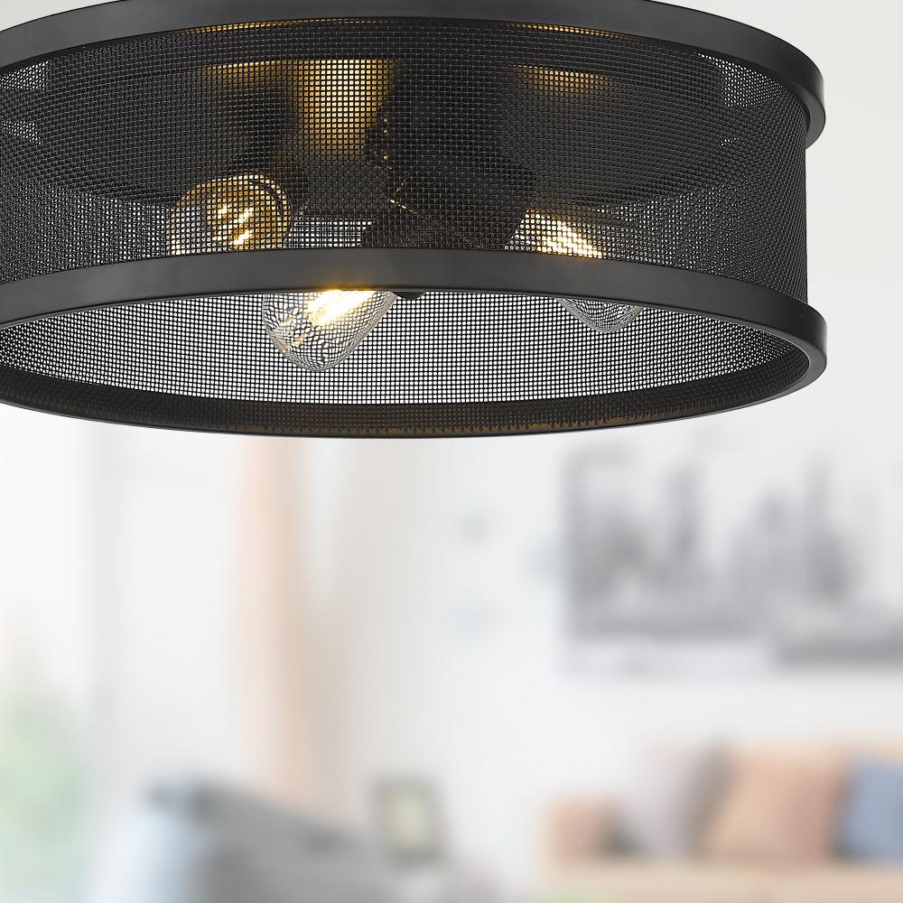 Bring industrial elegance into your home with the Golden Lighting Channing 3-light Flush Mount in Matte Black. Featuring a metal shade and a matte black frame, it creates a welcoming atmosphere. The fixture showcases a unique drum shade crafted from fine wire mesh, offering a textural, semi-transparent look that is quintessentially Industrial. This design captures a chic, urban aesthetic inspired by the utilitarian cages of factory lighting. The epitome of clean, modern style, the matte black finish is both timeless and endlessly versatile. Its deep, uniform black color has a true non-reflective matte surface that absorbs light, creating a soft, sophisticated look with a strong graphic quality. Ideal for low ceilings in hallways, closets, laundry areas, bathrooms, and more, this compact design meets wide illumination needs. It is damp location rated, making it suitable for covered and semi-enclosed spaces with occasional moisture, like bathrooms and covered porches. The fixture requires 3 E26 Medium base bulbs (not included), with a maximum wattage of 60 per bulb. Overall dimensions are 15"W x 4.75"H x 15"D, making it an excellent choice for smaller spaces. This light not only enhances the functionality of your home but also contributes to its overall style, ensuring quality and modern design in every corner.