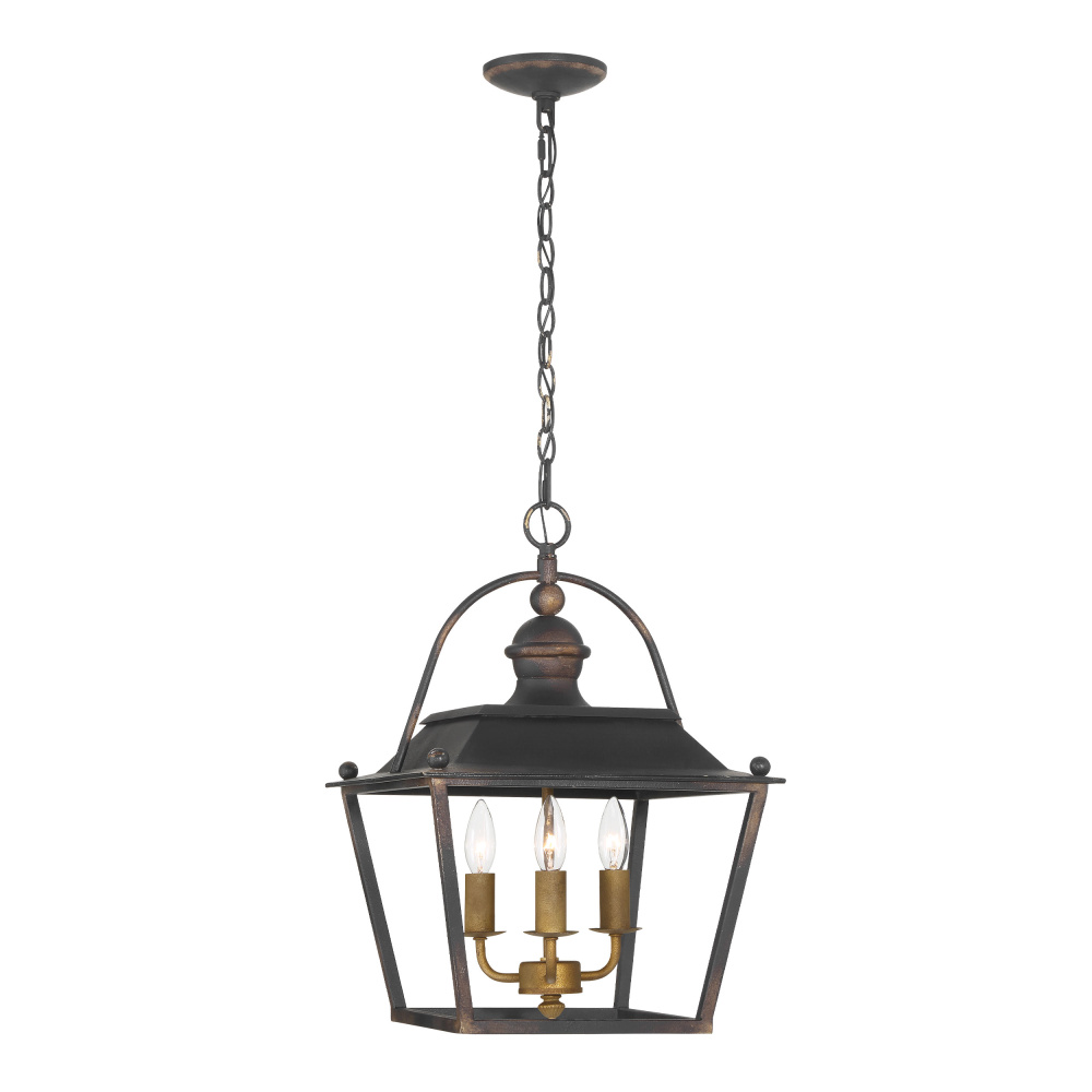 Bring timeless elegance into your home with the Golden Lighting Christoff 3-light Pendant. Featuring an antique black iron finish, it creates a welcoming atmosphere. Its classic lantern silhouette without a shade allows for bold light transmission, perfectly complementing the weathered character of the antique black iron finish, which reveals glimpses of a warm, antiqued gold base, enhancing the rustic charm. Ideal for dry location spaces, it is perfect for areas not subject to moisture, such as bedrooms, living rooms, and hallways. The convertible design offers adjustable heights from 23.5" to 97", allowing for installation as either a pendant or semi-flush mount. Overall Dimensions: 14"W x 20"H x 14"D. Requires 3 E12 Candelabra base bulbs (not included), max wattage 60 per bulb. Illuminate your home with this exquisite pendant, showcasing craftsmanship that elevates any interior space.