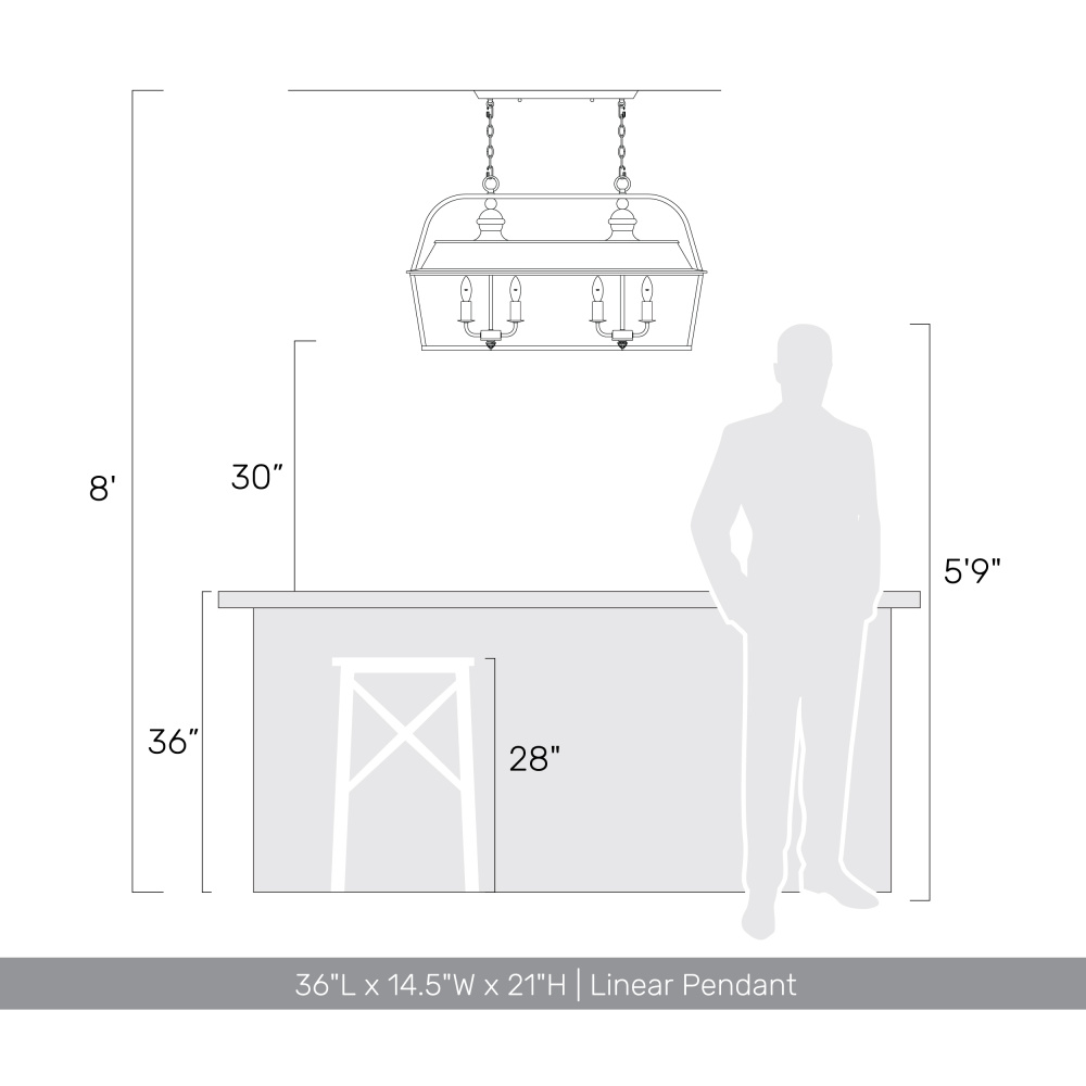 Bring traditional elegance into your home with the Golden Lighting Christoff 8-light Island Light. This striking fixture features an antique black iron finish that creates a warm and welcoming atmosphere. Designed without a shade, the eight candelabra bulbs provide ample light, perfect for illuminating kitchen islands and dining areas. The antique black iron finish features heavy textures and a weathered appearance, evoking a sense of history and craftsmanship, ideal for rustic and farmhouse aesthetics. Tailored for kitchen islands, this fixture is dry location rated, making it ideal for indoor use. It is also sloped-ceiling compatible and adjustable in height, allowing customization to suit your space. Overall Dimensions: 36"W x 21"H x 14.5"D. Requires 8 E12 candelabra base bulbs (not included), with a maximum wattage of 60 per bulb. Elevate your home with the timeless elegance of this stunning island light, designed to make a statement.