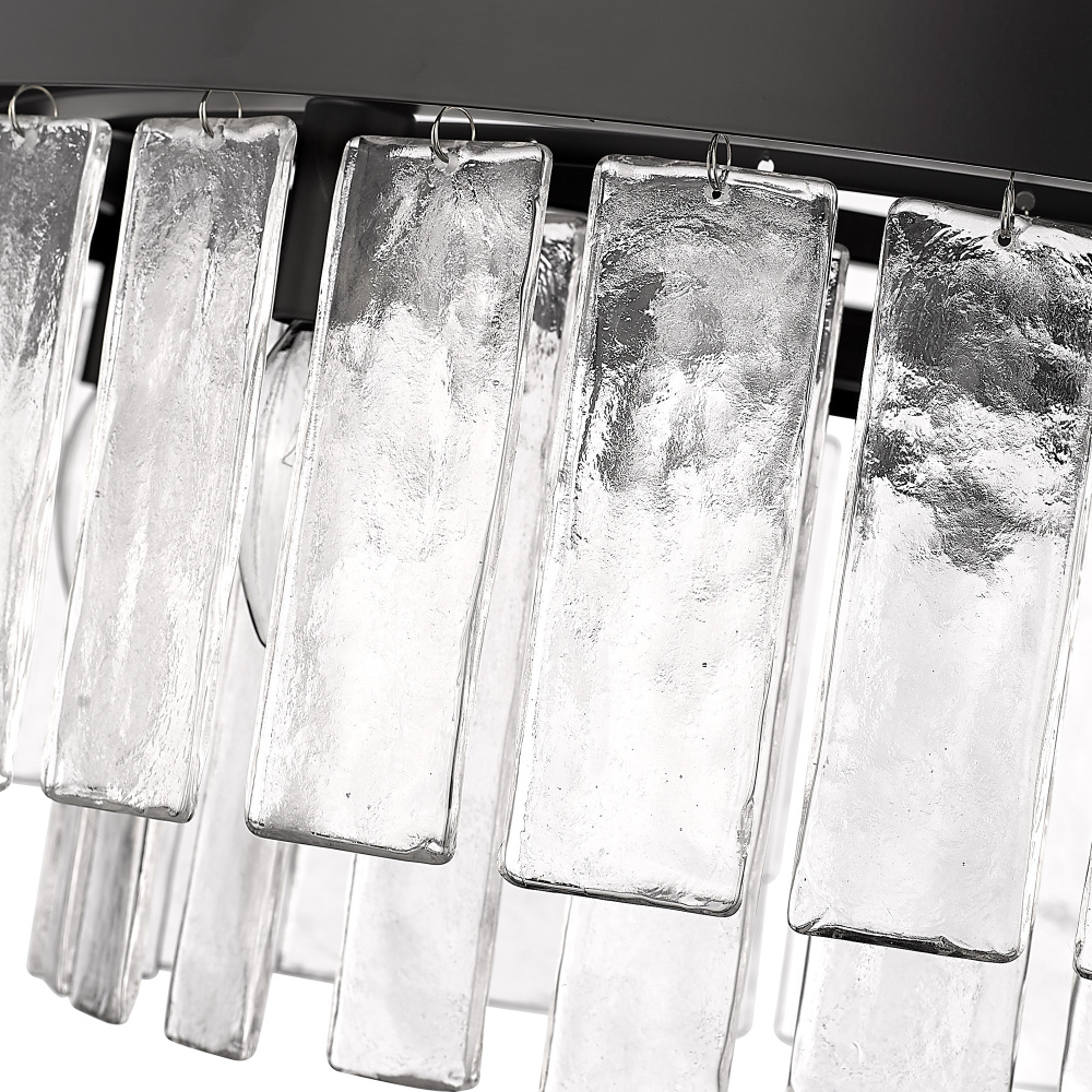 Introduce contemporary sophistication into your home with the Golden Lighting Ciara 6-light Flush Mount. Featuring beautifully crafted glass shades and a striking Matte Black frame, it creates an inviting ambiance. The hammered water glass showcases a unique texture that refracts light artistically, enhancing the elegance of this fixture. The Matte Black finish is non-reflective and complements various decor styles, from minimalist to bold contemporary. Perfect for low ceilings in hallways, closets, laundry areas, bathrooms, and more, this fixture is damp location rated for safety. It offers convertible installation options and is fully adjustable to fit your space. With dimensions of 42"W x 10.88"H x 10"D, this fixture requires 6 E26 medium base bulbs (not included), max 60 wattage each. The Ciara collection delivers quality craftsmanship and style, making it a fantastic addition to your home.