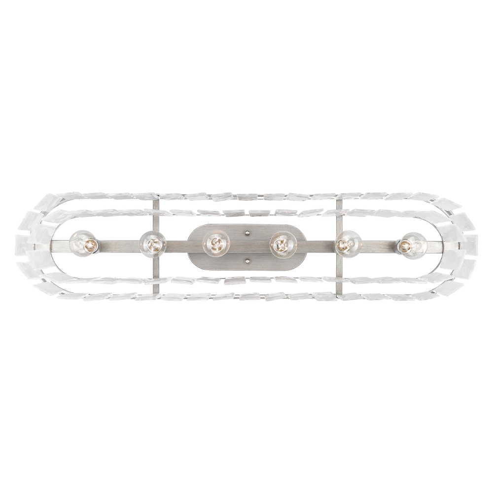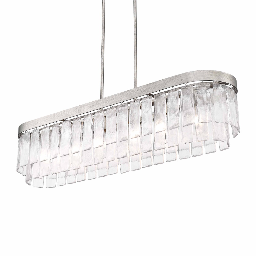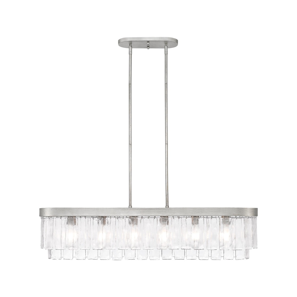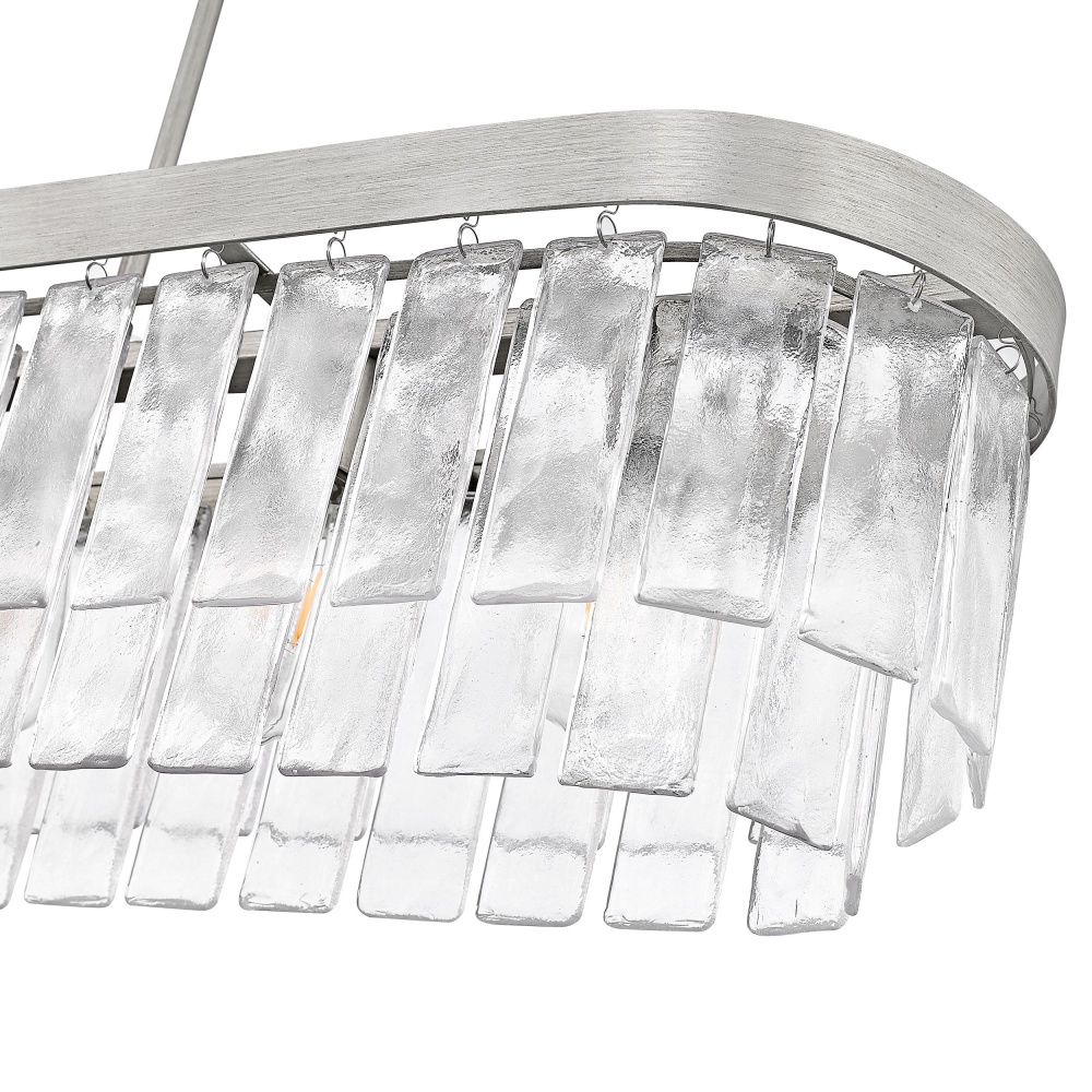 Bring Glam elegance into your home with the Golden Lighting Ciara 6-light Island Light in Peruvian Silver. Featuring a glass shade and a Peruvian Silver frame, it creates a welcoming atmosphere. This glass shade adds beauty and elegance with its Hammered Water Glass, distinguished by a heavy, irregular texture with a glossy finish, designed to create a beautifully distorted and refractive light effect. Inspired by the soft lustre of ancient handcrafted silver, the Peruvian Silver finish features a muted, weathered silver with warm undertones, artfully hand-brushed to enhance its rustic texture and rich patina. Tailored for kitchen islands, this damp location rated fixture is suitable for covered spaces with occasional moisture. The convertible design allows installation as a semi-flush mount or pendant, with an adjustable height from 10.875" to 54.75". With overall dimensions of 42"W x 10"H x 10"D, it requires 6 E26 Medium base bulbs (not included, max 60 watts per bulb). Elevate your space with this exquisite fixture, where artisanal craftsmanship meets timeless appeal.