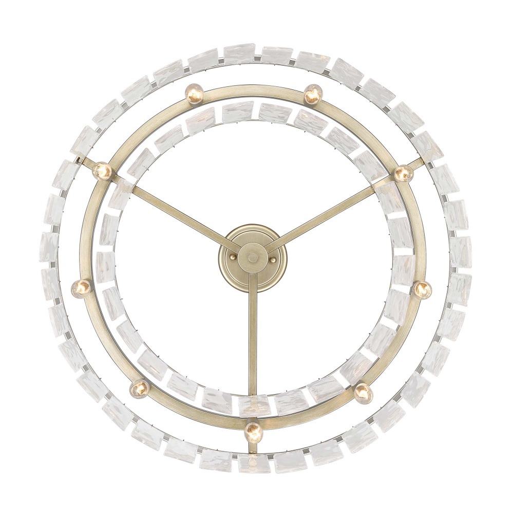 Bring Glam elegance into your home with the Golden Lighting Ciara 9-light Semi-Flush Mount. Featuring a glass shade and a White Gold frame, it creates a welcoming atmosphere. The hammered water glass shade provides a sophisticated light effect through its unique texture, beautifully catching and refracting illumination. The White Gold finish blends the warmth of gold with the coolness of silver, offering a rustic texture and a soft patina that brings an artisanal touch to any space. This fixture is ideal for mid-height ceilings and damp location rated, suitable for areas that may experience occasional moisture. The convertible construction allows for flexible installation, adapting to different ceiling heights effortlessly. Dimensions measure 27"W x 11"H x 27"D, and it requires 9 E12 Candelabra base bulbs (not included) with a maximum wattage of 60 per bulb. Transform your home with this stunning piece that emphasizes quality and style.