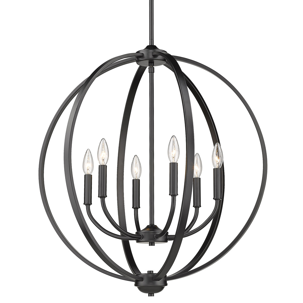 Bring modern elegance into your home with the Golden Lighting Colson 6-light Chandelier in Matte Black. Featuring a design that omits a shade, it creates a warm and inviting atmosphere in any space. This chandelier showcases a classic candelabra nestled within a clean open-orb frame, perfect for enhancing both classic and contemporary interiors. The Matte Black finish is a timeless choice, offering a deep, non-reflective surface that absorbs light while creating a sophisticated graphic quality. Its smooth texture invites a modern touch to your decor. Ideal for dining rooms, foyers, or as a statement piece in living areas, this fixture is dry location rated to ensure safety indoors. Designed for versatility, it features adjustable height settings to cater to various ceiling heights. Overall dimensions are 26"W x 28.75"H x 26"D, and it requires 6 E12 candelabra base bulbs (not included) with a maximum wattage of 60 per bulb. Quality and craftsmanship from Golden Lighting ensure that this chandelier will be a stunning focal point in your home for years to come.