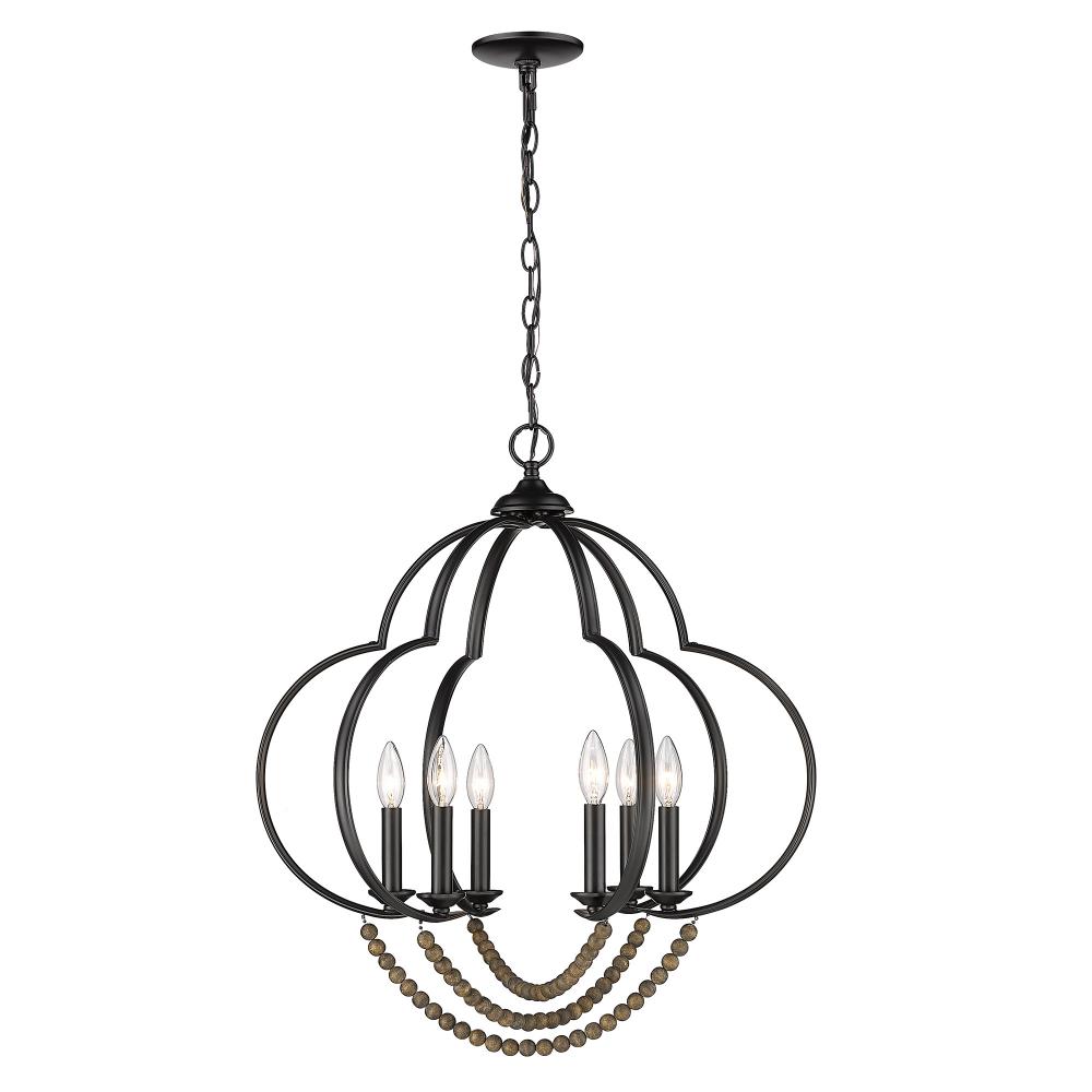 Bring Bohemian elegance into your home with the Golden Lighting Flori 6-light Pendant. Featuring a sleek Matte Black finish, it creates an inviting and artistic atmosphere that enhances your living spaces. The unique draping of natural wood beads provides a textural and artisanal element, making this pendant a true statement piece. With its open-frame silhouette, the Flori pendant radiates light beautifully, complementing its sophisticated design. This fixture is Dry Location Rated, making it suitable for various indoor spaces, including dining rooms, foyers, and living areas. It is sloped-ceiling compatible, and the adjustable height ranges from 28.13" to 100.13", allowing for flexible installation tailored to your space. Overall Dimensions: 24.25"W x 27.25"H x 24.25"D. Requires 6 E12 Candelabra base bulbs (not included). Max wattage per bulb is 60 watts. Elevate your home with the Golden Lighting Flori pendant, where unique design meets functional beauty, adding an eclectic touch to any room.