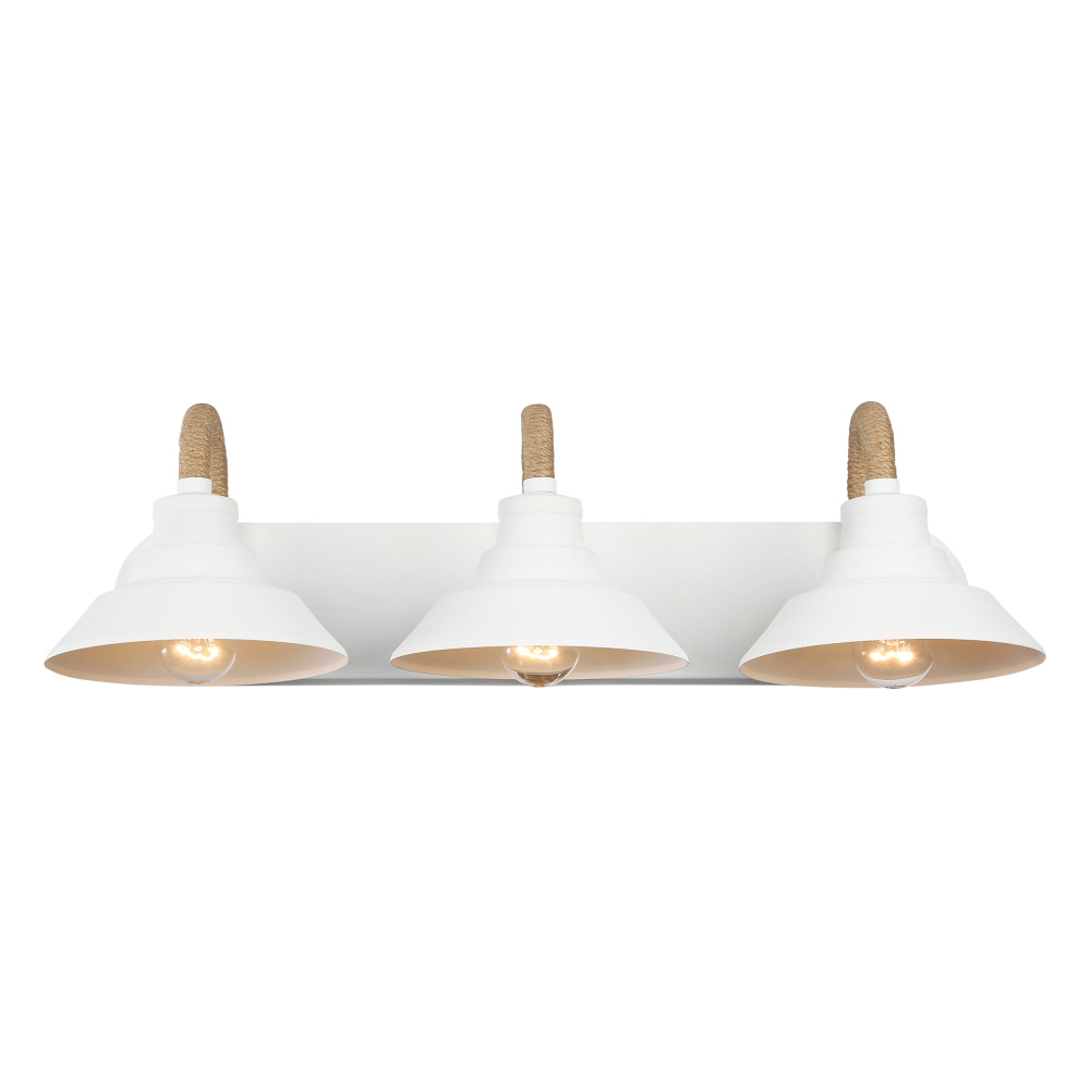 Add a touch of serenity to your space with the Golden Lighting Journey 3-light Vanity in Natural White. Featuring a metal shade and a Natural White frame, it creates a calm and inviting atmosphere. This vanity light incorporates natural rope-wrapped accents that give it a distinct nautical and textural element, perfect for seaside-inspired interiors. The Natural White finish provides a clean, neutral look with a chalky, non-reflective matte surface, making it an ideal foundational design for modern farmhouse, coastal, and minimalist styles. Brighten up bathrooms with dedicated lighting that flatters while providing practical task illumination. Damp Location Rated: Suitable for covered and semi-enclosed spaces with occasional moisture, like bathrooms, covered porches, and laundry rooms. Overall Dimensions: 26"W x 7.63"H x 9.38"D. Requires 3 E26 Medium base bulbs (not included). Max 100 wattage per bulb. Transform your bathroom into a coastal retreat with this solidly constructed vanity light that is both easy to install and beautiful.
