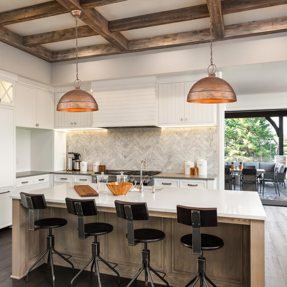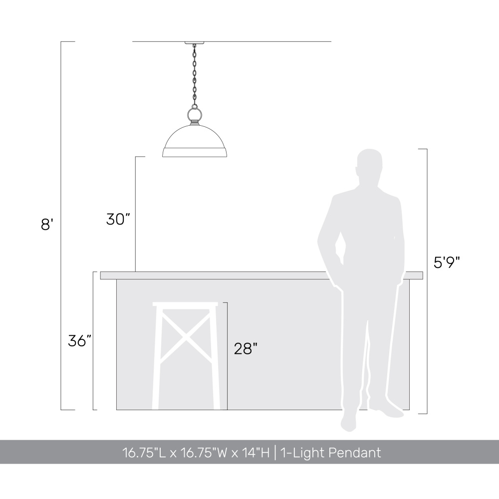 Bring timeless farmhouse elegance into your home with the Golden Lighting Lincoln 1-light Pendant. Featuring a metal shade and a Vintage Copper frame, it creates a welcoming atmosphere. The metal shade beautifully complements the heavily textured Vintage Copper finish, inspired by the rich patina of old-world cookware. This charm enhances the rustic appeal, making it perfect for eclectic spaces. With damp location ratings, this pendant is suitable for covered and semi-enclosed spaces, such as kitchens, dining rooms, and even bathrooms. The sloped-ceiling compatible design allows for easy installation while providing adjustable height from 17" to 89". Overall Dimensions: 16.75"W x 14"H x 16.75"D, requiring 1 E26 Medium base bulbs (not included) with a maximum wattage of 100. This pendant not only enhances your space but also reflects quality craftsmanship, making it an ideal fixture for a cozy ambiance.