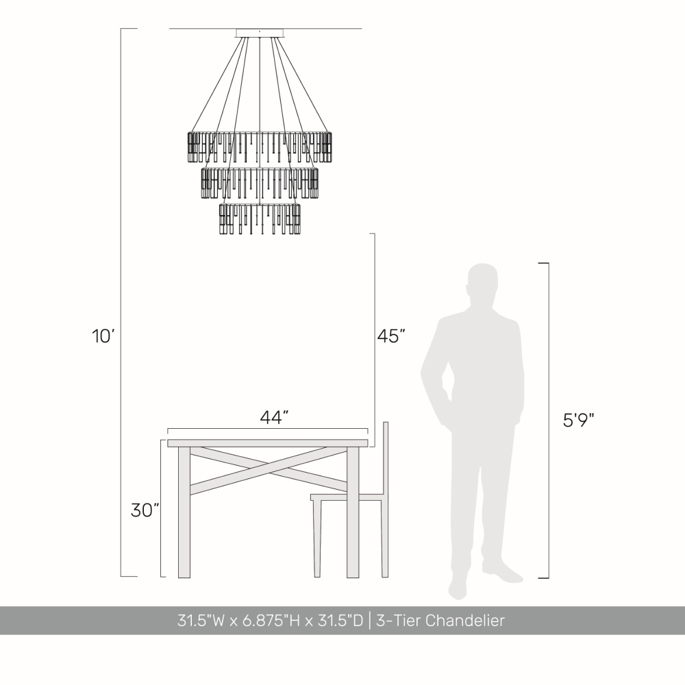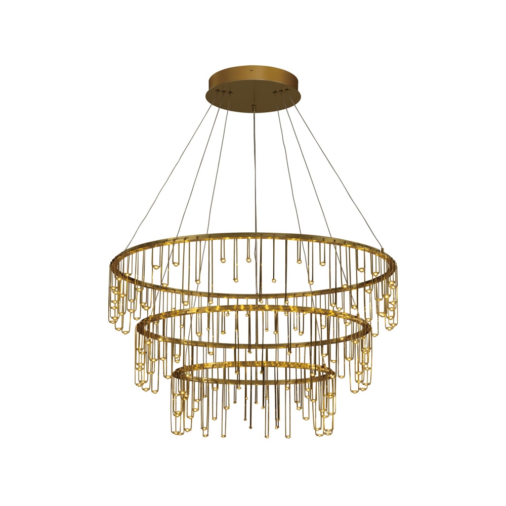 Bring modern elegance into your home with the Golden Lighting Lucerna Integrated LED 3-tier Chandelier. This avant-garde design creates a welcoming atmosphere with its sculptural silhouette and striking finish. Crafted from stainless steel, this fixture boasts a touch-friendly frame that remains safe to touch, ensuring both practical functionality and peace of mind. Experience the pinnacle of quality with an exceptional Stainless Steel Gold finish that exudes modern luxury. The rich, warm layer of gold, electroplated onto solid stainless steel, creates a resilient finish that glows with a soft satin lustre. Versatile for various applications, it's ideal for indoor spaces such as bedrooms, dining rooms, living rooms, and hallways. Its dry location rating makes it perfect for areas not subject to moisture. The fixture is sloped-ceiling compatible and features an adjustable height of 9.375" to 129.375", ensuring easy installation and customization. Overall dimensions are 31.5"W x 6.88"H x 31.5"D, and it features integrated LED technology that provides brilliant illumination at 5832 rated lumens with a warm 3000K CCT. Close the day with style and elegance, offering both quality and modern appeal to your living spaces.