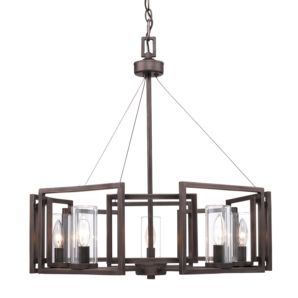 Bring modern elegance into your home with the Golden Lighting Marco 5-light Chandelier in Gunmetal Bronze. Featuring a glass shade and a gunmetal bronze frame, it creates a welcoming atmosphere. The clear glass shade features a smooth, polished texture that offers brilliant, unobstructed light, allowing the beauty of the bulb to take center stage. Our gunmetal bronze finish masterfully blends warmth and industrial edge, resulting in a chic, substantial look that shifts in character with the light, perfect for any sophisticated space. Ideal for indoor areas not subject to moisture, this chandelier is sloped-ceiling compatible and adjustable height, ensuring a perfect fit in dining rooms, living rooms, or bedrooms with a customizable hanging length of 29.625" to 98.5". Dimensions: Overall 24.5"W x 25.38"H x 24.5"D. Requires 5 E12 candelabra base bulbs (not included), max 60 wattage per bulb. Make a bold architectural statement with this stunning fixture, designed to seamlessly blend with your decorating style while offering exceptional quality.