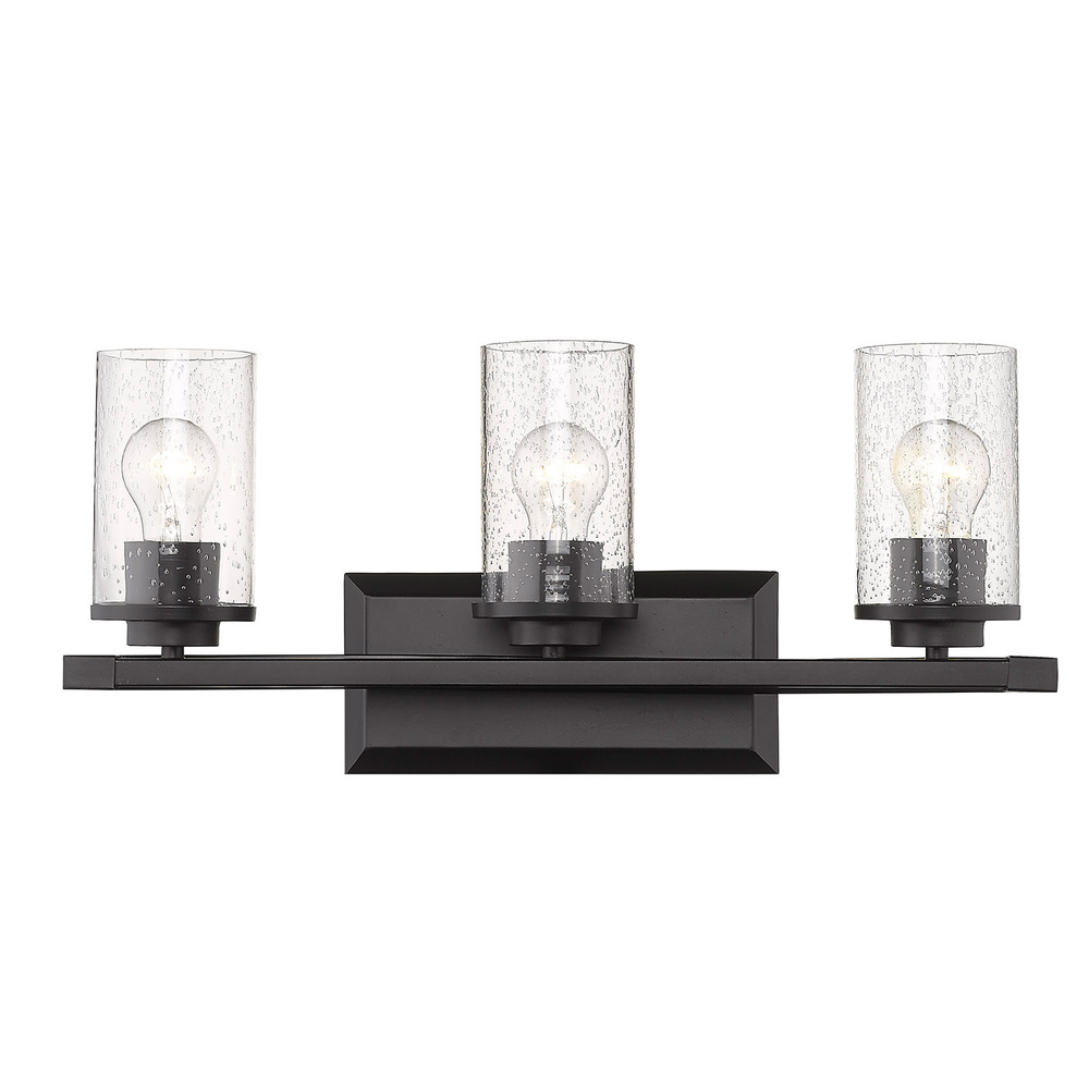 Bring modern elegance into your home with the Golden Lighting Mercer 3-light Vanity in Matte Black. Featuring a glass shade and a matte black frame, it creates a welcoming atmosphere. The seeded glass shade adds a touch of vintage character and artisanal charm with its unique, antique-inspired texture that gently diffuses light. Its matte black finish provides a timeless and versatile appeal, smoothly complementing any decor. Ideal for bathrooms, it is damp location rated, suitable for spaces with occasional moisture. The overall dimensions are 22"W x 9.63"H x 5"D, and it requires 3 E26 medium base bulbs (not included), with a maximum wattage of 60 per bulb. Elevate your bathroom's aesthetic with this elegant lighting fixture that promises a soft and sophisticated glow.