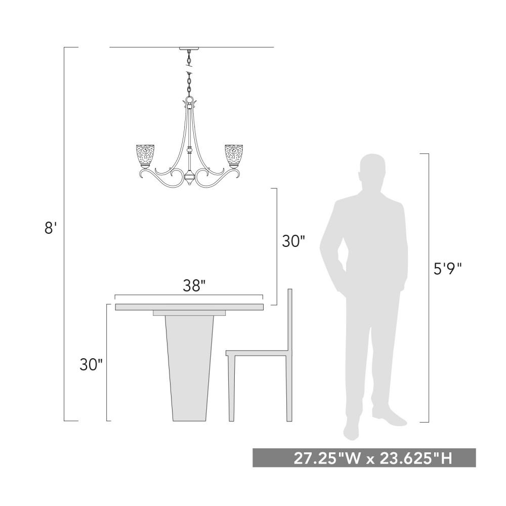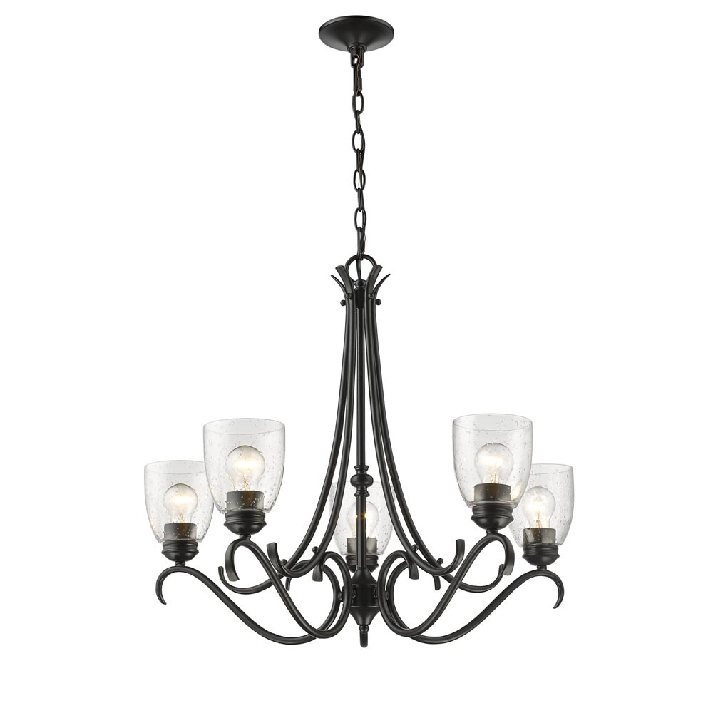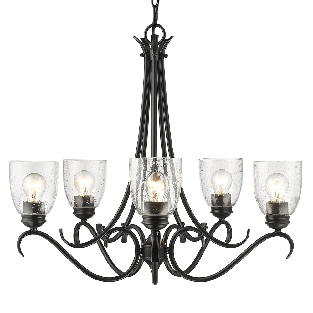 Bring timeless elegance into your home with the Golden Lighting Parrish 5-light Chandelier in Matte Black. Featuring a glass shade and a matte black frame, it creates a welcoming atmosphere. The seeded glass shade adds a touch of vintage character and artisanal charm, characterized by tiny infused air bubbles that create a unique, textural look. The matte black finish is smooth to the touch and offers an understated elegance that complements various decors. Perfect for indoor spaces like dining rooms and living areas, this chandelier is dry location rated, ensuring durability. Installation is a breeze with its sloped-ceiling compatibility and adjustable height, ranging from 24.625" to 96.625". With overall dimensions of 27.25"W x 23.63"H x 27.25"D, and requiring 5 E26 medium base bulbs (not included), this fixture not only illuminates but enhances your living space with its classic design and quality craftsmanship.