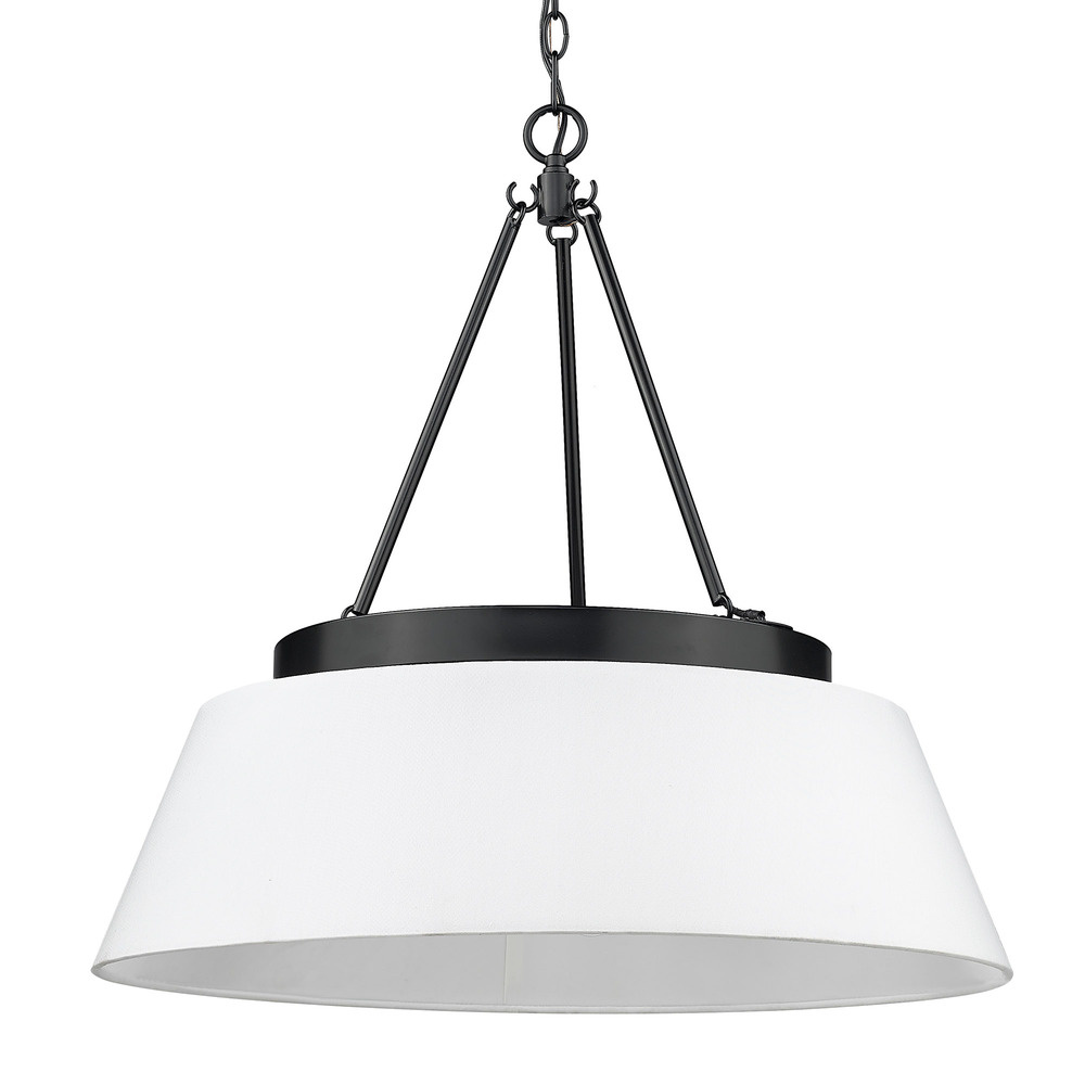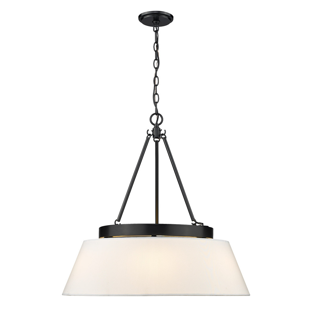 Bring modern elegance into your home with the Golden Lighting Penn 6-light Chandelier. Featuring a fabric shade and a sleek matte black frame, it creates a welcoming ambiance that speaks of class. The modern white fabric shade ensures a soft, diffused glow, offering both style and warmth. It complements the sophisticated design of the chandelier, enhancing the illumination while adding a tailored look. The matte black finish extends timeless versatility with a clean, smooth surface, making it an ideal centerpiece for various decor styles. Perfect for dining rooms or foyers, this fixture is dry location rated, suitable for indoor spaces like bedrooms, living rooms, and hallways. It's designed for easy installation on sloped ceilings and adjustable in height from 29.125" to 98.625", with overall dimensions of 26"W x 25.88"H x 26"D. Requires 6 E26 medium base bulbs (not included) with a maximum wattage of 60 per bulb. Accentuate your home with the quality and style of the Golden Lighting Penn, a true statement piece.