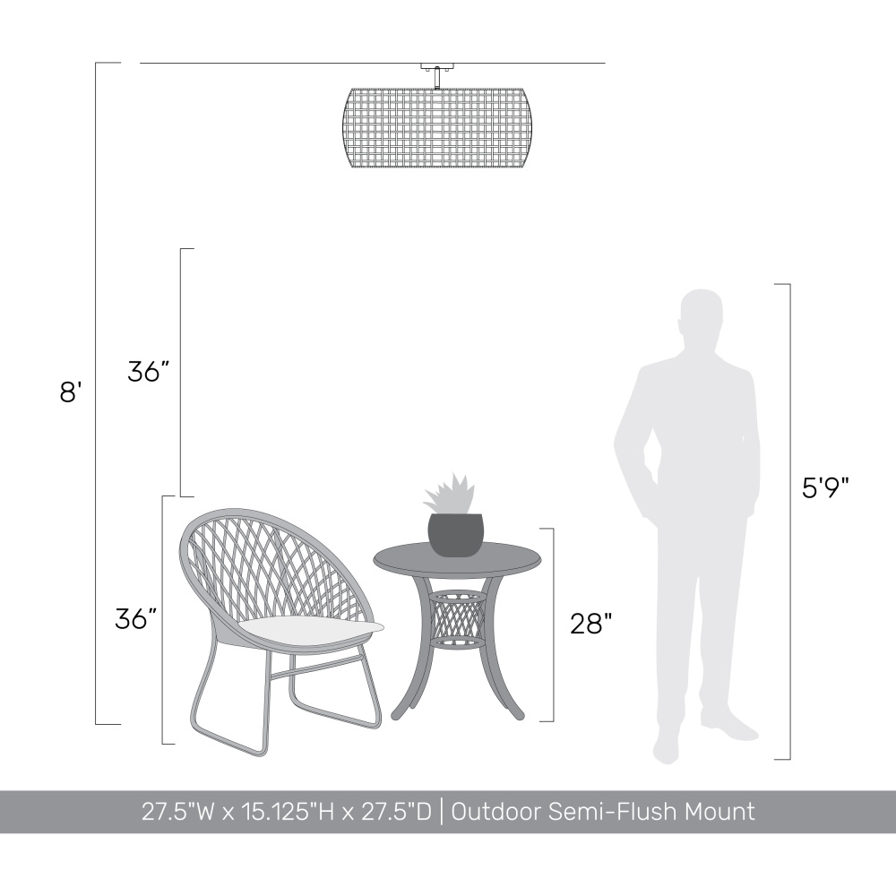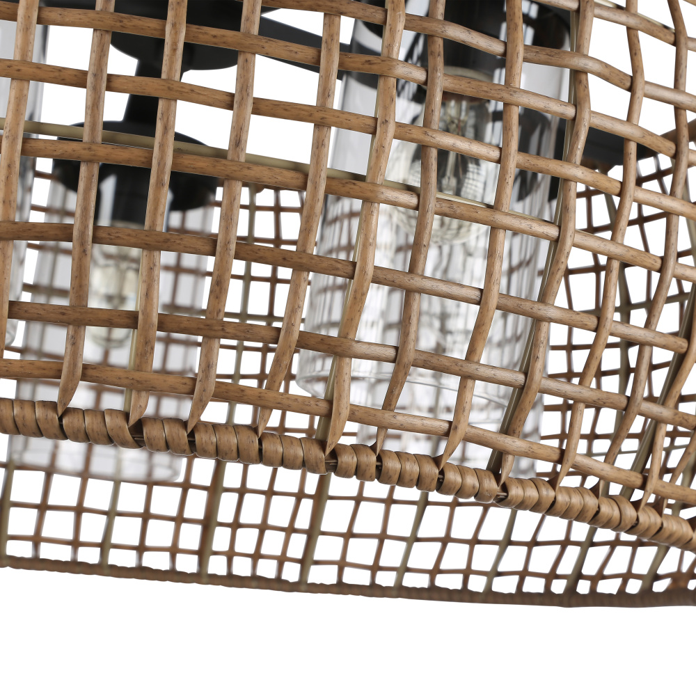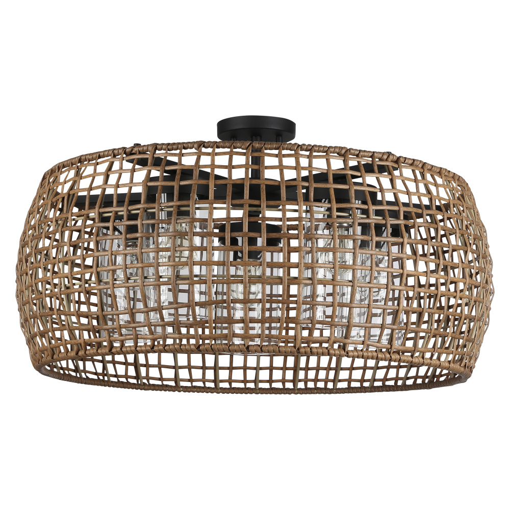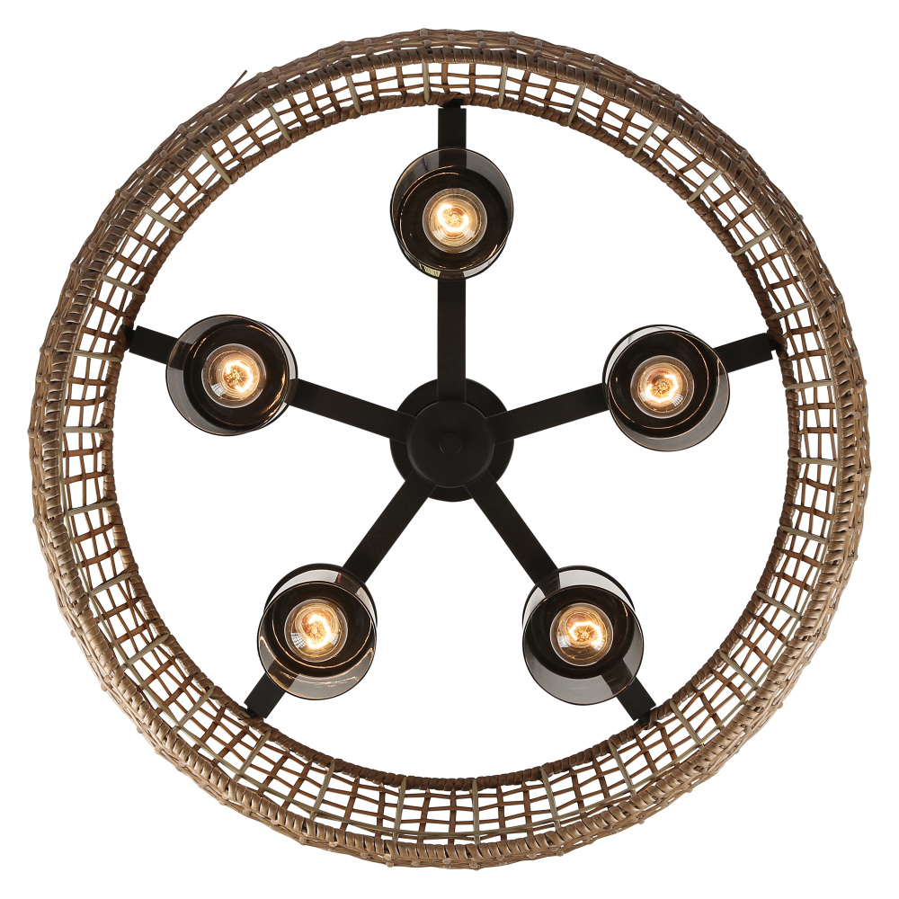 Bring nature-inspired elegance into your home with the Golden Lighting Piper 5-light Outdoor Ceiling in Natural Black. Featuring a wicker shade and a natural black frame, it creates a welcoming atmosphere. The Maple All-Weather Wicker shade introduces a rustic bohemian charm, handcrafted from durable synthetic materials into a beautiful open-weave pattern, allowing for lovely light dispersion and a relaxed vibe. The soft natural black finish delivers a gentle look, offering versatility to suit a variety of styles, from industrial to transitional. Ideal for porches, gazebos, or outdoor kitchens, this fixture is wet location rated which means it withstands rain and snow, ensuring lasting beauty outdoors. The convertible design allows for installation as a semi-flush mount or pendant, with an adjustable height feature for perfect fit in any space. Overall dimensions are 27.5"W x 15.13"H x 27.5"D, requiring five E26 medium base bulbs (not included) with a max wattage of 100 each. Embrace this stylish fixture that effortlessly combines quality with exceptional design, illuminating your outdoor gatherings with a warm and inviting ambiance.