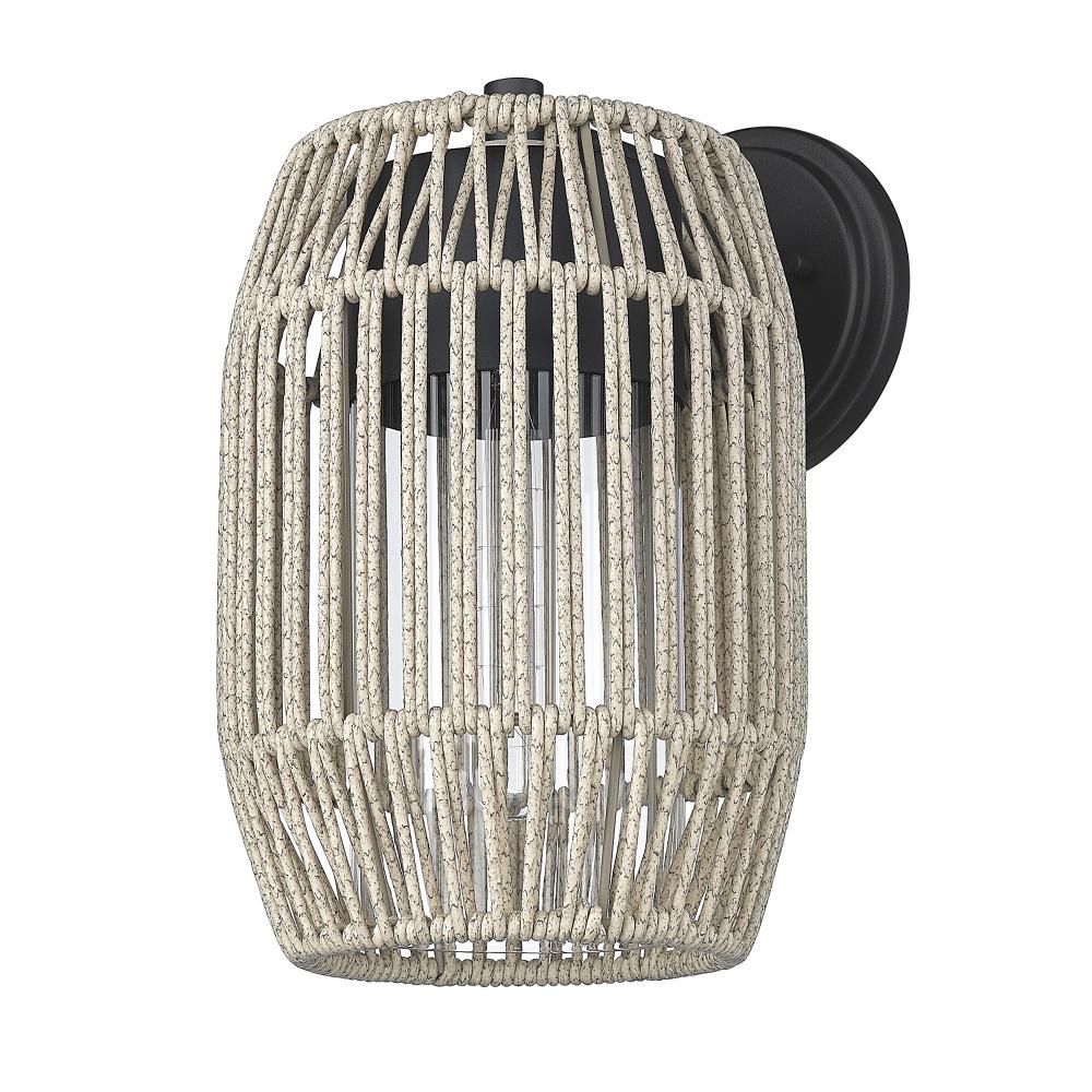 Bring boho sophistication into your home with the Golden Lighting Seabrooke 1-light Outdoor Wall in Natural Black. Featuring a glass shade and a Natural Black frame, it creates a welcoming atmosphere. The glass shade beautifully showcases a multi-tonal, twisted cord design reminiscent of sun-drenched beaches, casting airy patterns of light and shadow. Crafted with an open weave, this unique shade enhances organic appeal, perfect for a relaxed, coastal setting. Our Natural Black finish offers a gentler take on classic black, with a soft, chalky surface that complements various styles, from modern farmhouse to industrial. Functional and inviting at entryways, patios, and garage doors, this fixture is Wet Location Rated, designed to withstand direct exposure to rain and snow. Requires 1 E26 Medium base bulb (not included) with a maximum wattage of 60W. Dimensions: 7.5"W x 12.38"H x 9"D. Elevate your outdoor experience with the elegant durability and handcrafted quality of the Seabrooke light fixture.