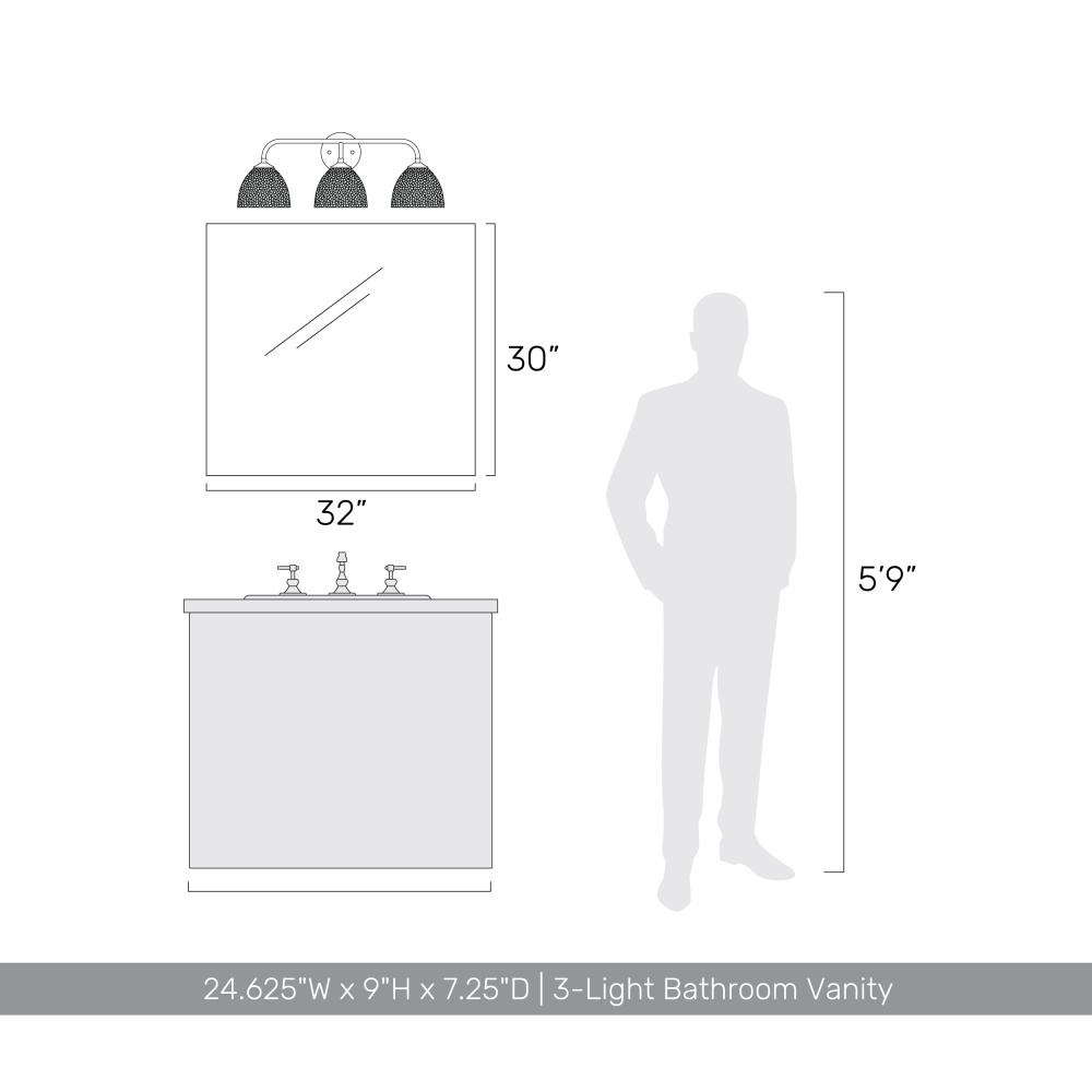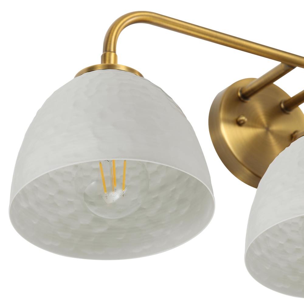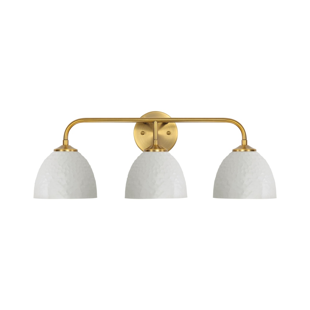Bring farmhouse elegance into your home with the Golden Lighting Shepard 3-light Vanity. Featuring a metal shade and a modern brass frame, it creates a welcoming atmosphere. This metal shade features a Matte White finish that is clean and crisp with a non-reflective texture, bringing a sophisticated modern touch to the design. The modern brass finish offers a muted hue and a rich patina that complements various decor styles. Brighten up bathrooms with dedicated lighting that flatters while providing practical task illumination. The fixture is damp location rated, suitable for covered spaces with occasional moisture, making it perfect for bathrooms, covered porches, and laundry rooms. Overall Dimensions: 24.63"W x 9"H x 7.25"D, requires 3 E26 Medium base bulbs (not included) with a maximum wattage of 100 per bulb. Achieve an elegant and cozy atmosphere effortlessly with this versatile lighting fixture.