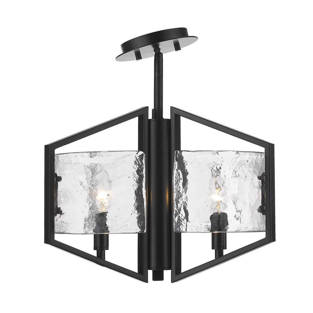Bring contemporary elegance into your home with the Golden Lighting Varsha 3-light Semi-Flush Mount. Featuring a glass shade and a matte black frame, it creates a welcoming atmosphere. The glass shade flaunts a hammered water glass design, with an organic texture that beautifully distorts and refracts light, enriching your space with a sophisticated glow. This matte black finish is timeless, offering a versatile touch that complements a variety of decor styles. Designed for entryways, bedrooms, kitchens, and living areas with mid-height ceilings, this semi-flush mount is damp location rated, making it suitable for areas with occasional moisture. Installation is straightforward and safely accommodates angled ceilings. Overall Dimensions: 16.75"W x 14.88"H x 16.75"D. Requires 3 E12 candelabra base bulbs (not included), with a maximum wattage of 60 per bulb. With its combination of style and practicality, the Varsha Semi-Flush Mount adds a stylish touch to any room while prioritizing quality.