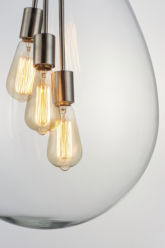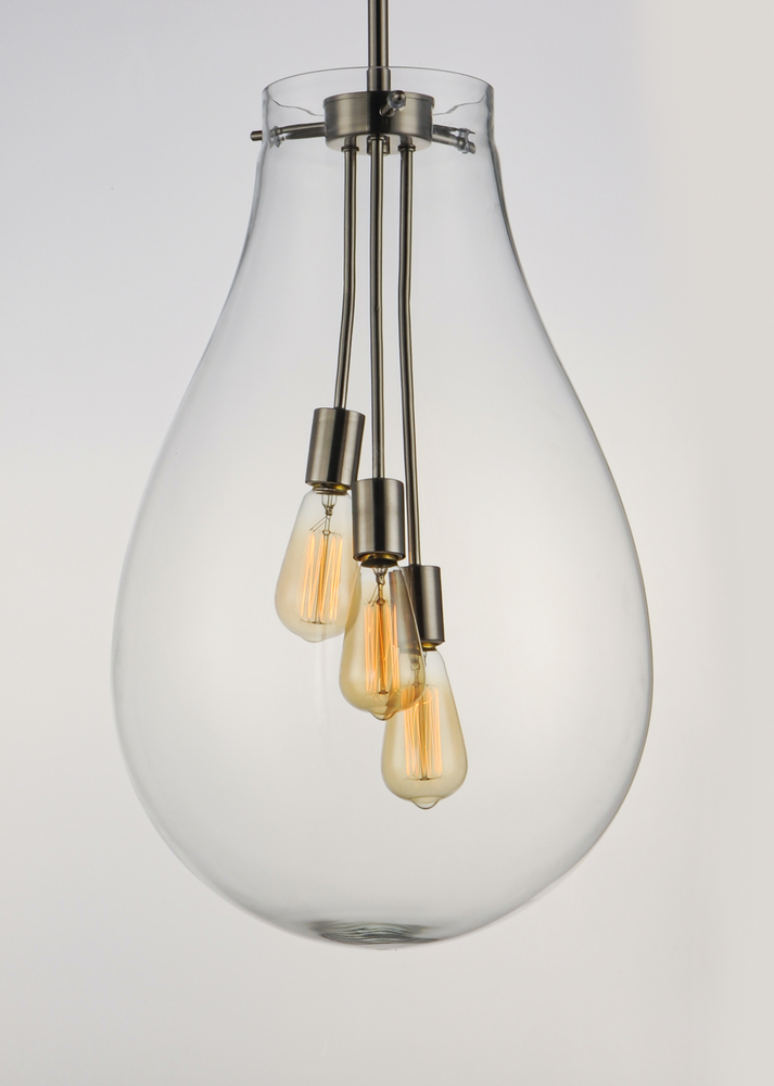 The crystal clear, large-scale glass pendants attest to the craft of hand-blown glass with their impressive scale. These hand crafted glass pendants embody simplicity and minimalism. Accented with Satin Nickel hardware, the style pairs well in a variety of