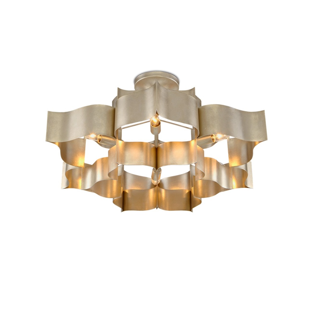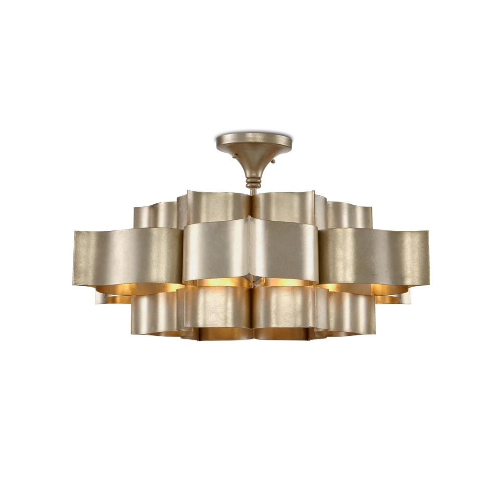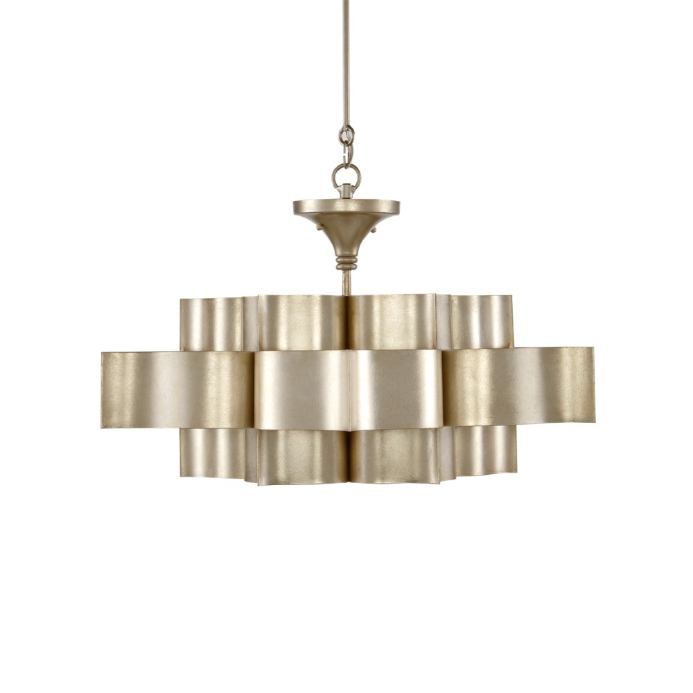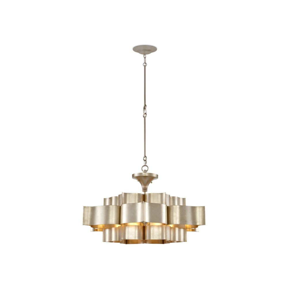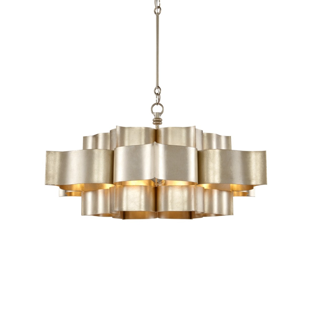 This silver version of the Grand Lotus Chandelier receives its majestic good looks from a combination of stunning workmanship and antique contemporary silver leaf finish. Skillfully fashioned from wrought iron, the Grand Lotus chandelier is a gorgeous interpretation of the blossom upon which Asian deities are known to pose. The six-light fixture measures 30 inches in diameter and is adjustable in height. We also offer this chandelier, which is one of several fixtures in the Grand Lotus collection, in an antique gold leaf finish.