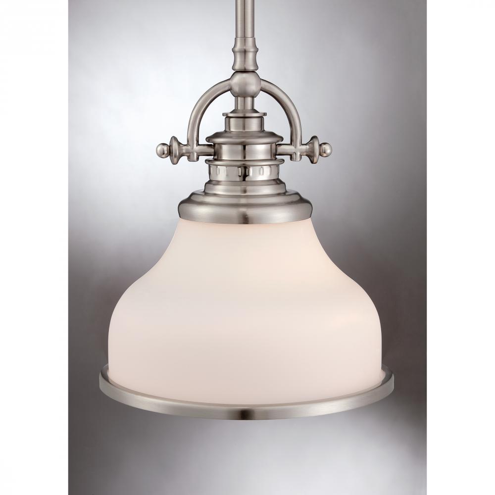 This opal etched glass fixture is an elegant nod to the past. The classic Americana styling adds a nostalgic flair to your home. When hung over a kitchen island or dinette table it provides ample lighting for all your daily tasks. It is available in Bru