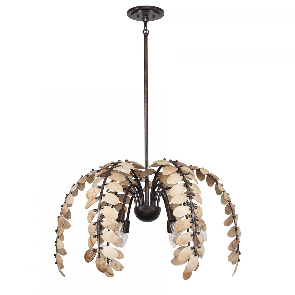 The Savoy House Grecian 6-light chandelier was designed by Breegan Jane, an award-winning interior designer and TV host. Boasting a charming cascade of branches decorated with leaves crafted from stained natural coco shell pieces, Grecian is a standout example of Breegan's signature nature-inspired designs influenced by her love of the Mediterranean. Each piece of coco shell is unique and may feature variations in patterning and color. A hand-applied Champagne Mist finish adds richness and texture. Grecian is 18" in height and 30" in width. Comes with four 12" downrods and one 6" downrod. Uses six candelabra size bulbs of up to 60 watts per bulb. Bulbs not included.