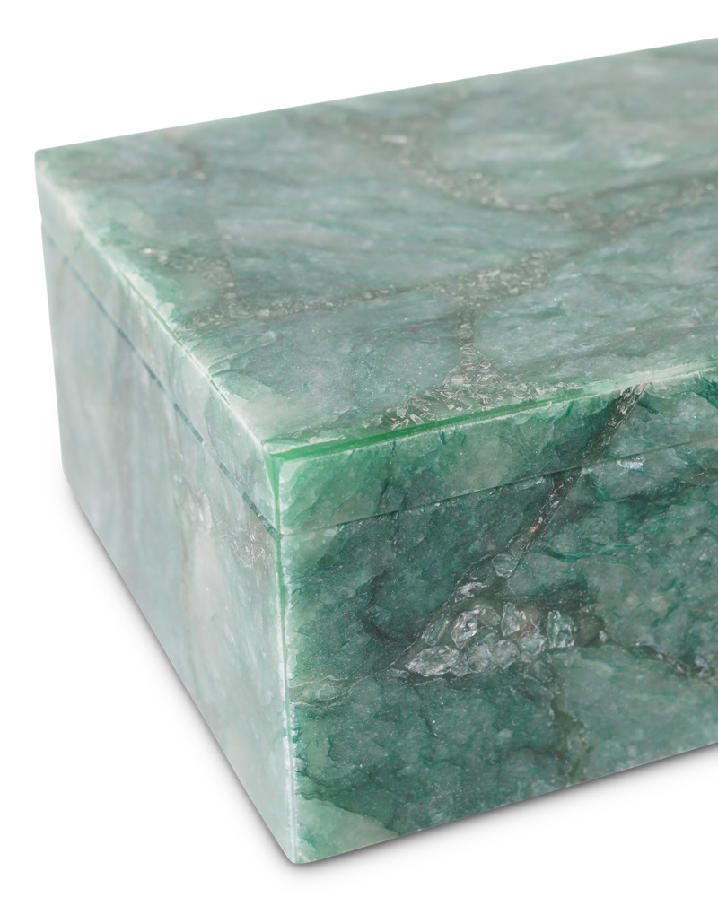 The Green Aventurine Box is a luminous decorative box made of stone. The solid translucent quartz panels that are glued together to create the accessory with an abundance of sheen has the natural material to thank for its iridescence. Because this is an elemental piece, there will be significant variations from box to box, some with a greater number of lighter green tones and others with fewer. The inside of the box has been honed so it is smoother while the outside is matte.