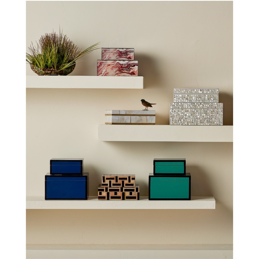 Nothing beats the sheen of lacquer where decorative boxes are concerned, as is evident in the sleek surfaces of the Green Lacquer Box Set. Made of wood, the pair of boxes have been covered in the time-honored process that has been valued in interior design for so long. The glossy green surfaces are rimmed in rich black, and the interiors are in a matte black finish. The pair of green boxes is made to nest or to stand separately.