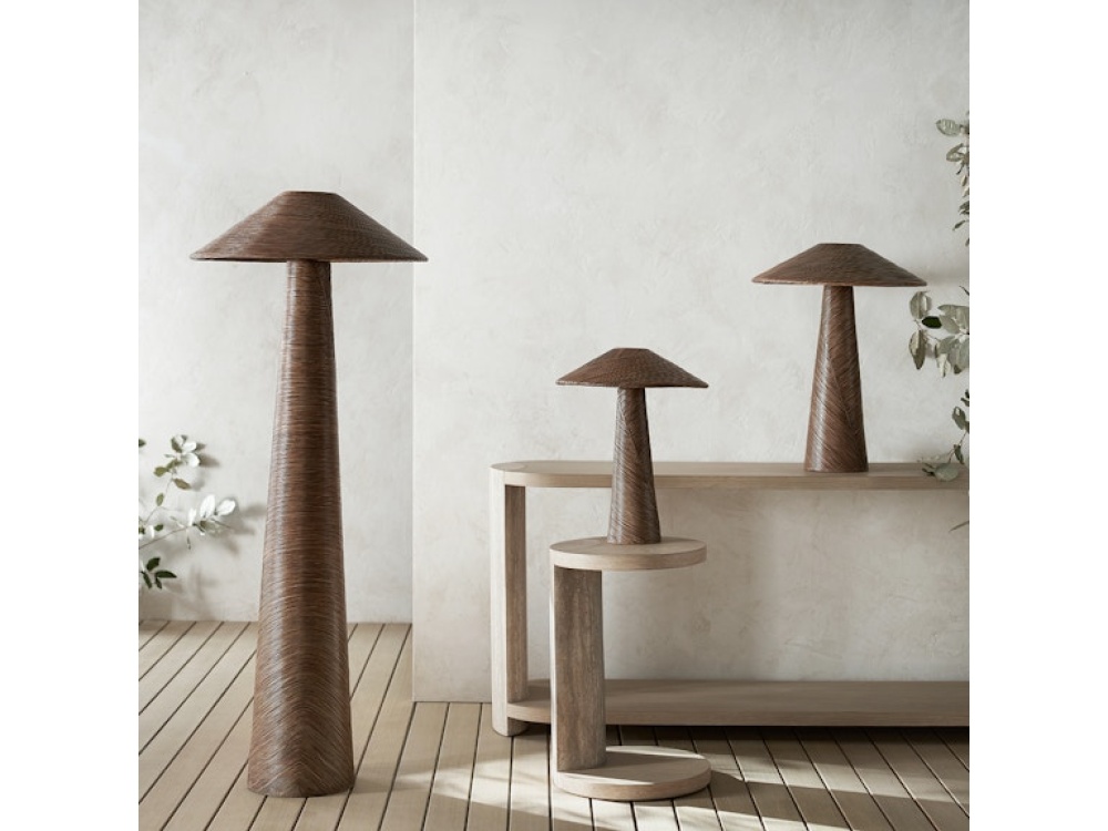 Core rattan hand-wrapped and intricately placed over the body and shade all in a walnut brown finish
