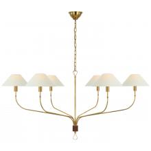 Griffin Grande Tail Chandelier in Bronze and Chocolate Leather with Linen Shades