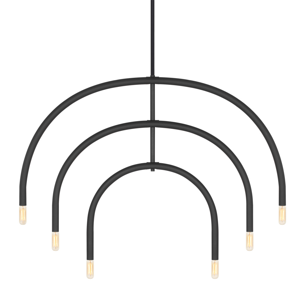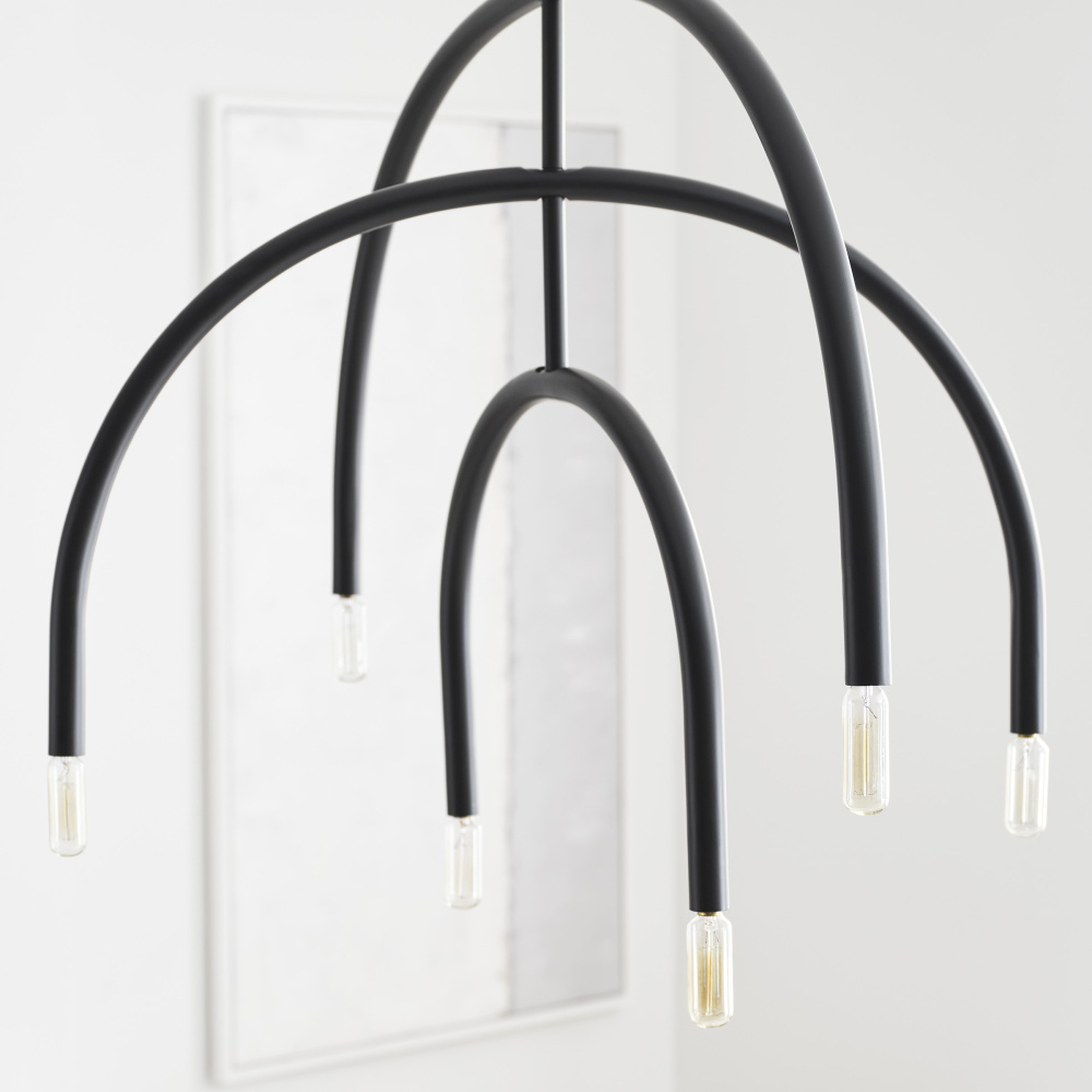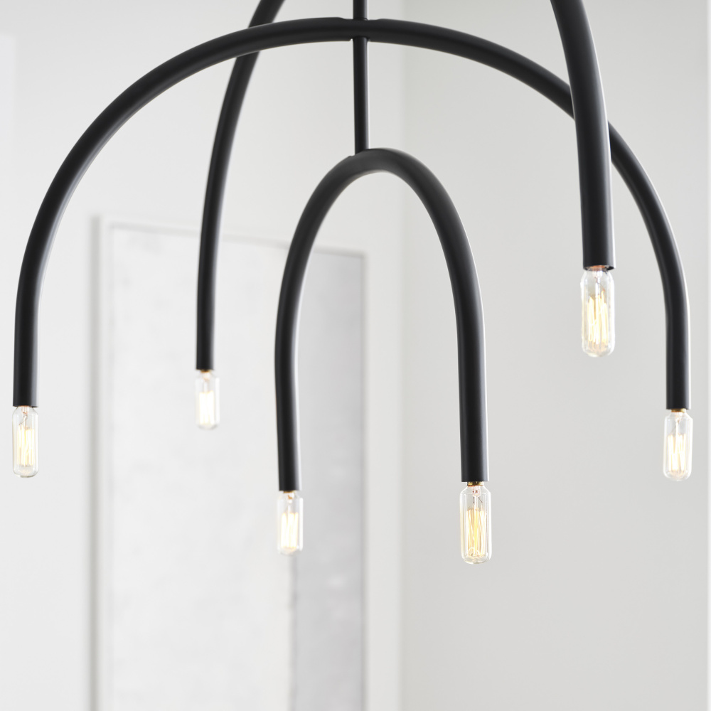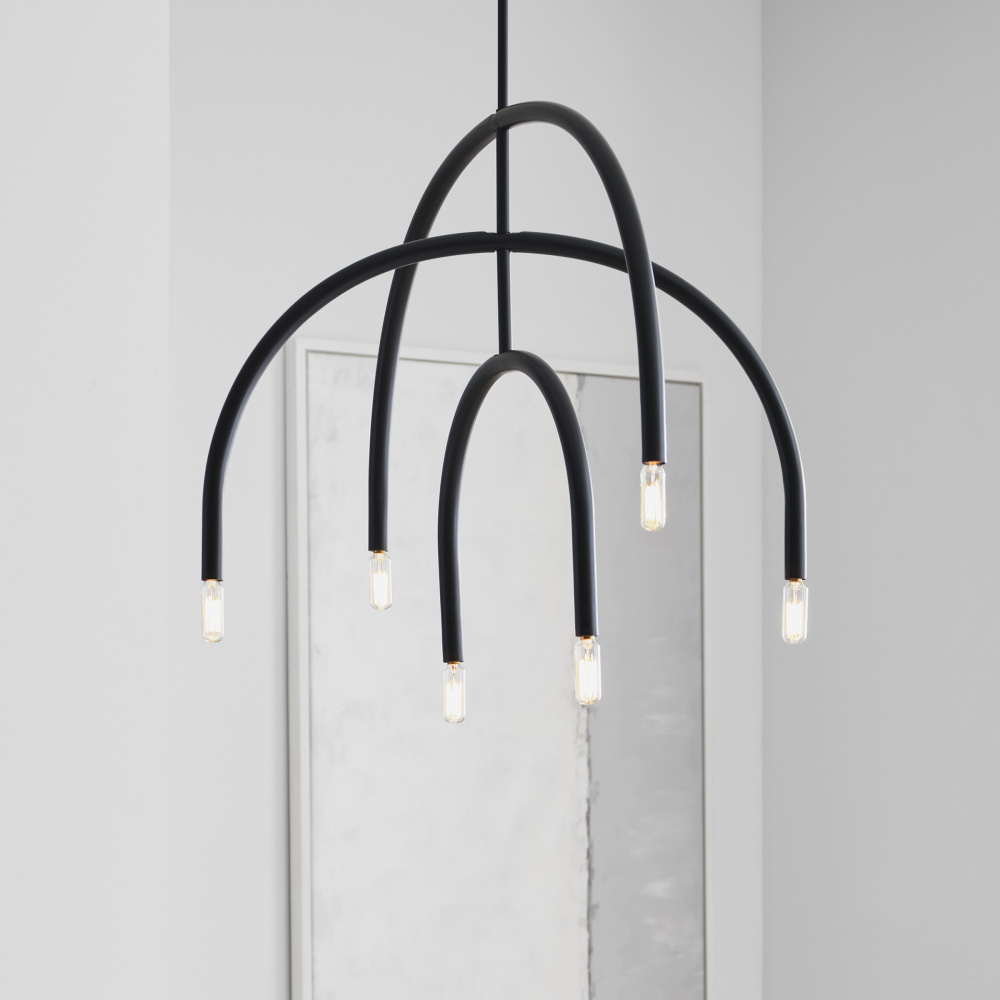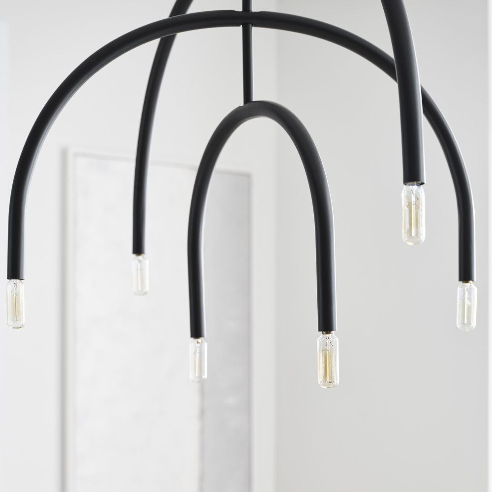 Add a modern statement with this unique chandelier. Hadden's mobile-like form allows you to adjust the arcing arms for an arrangement of your design. Playfully proportioned center hub and two finish options give this series plenty of elegant contrast.