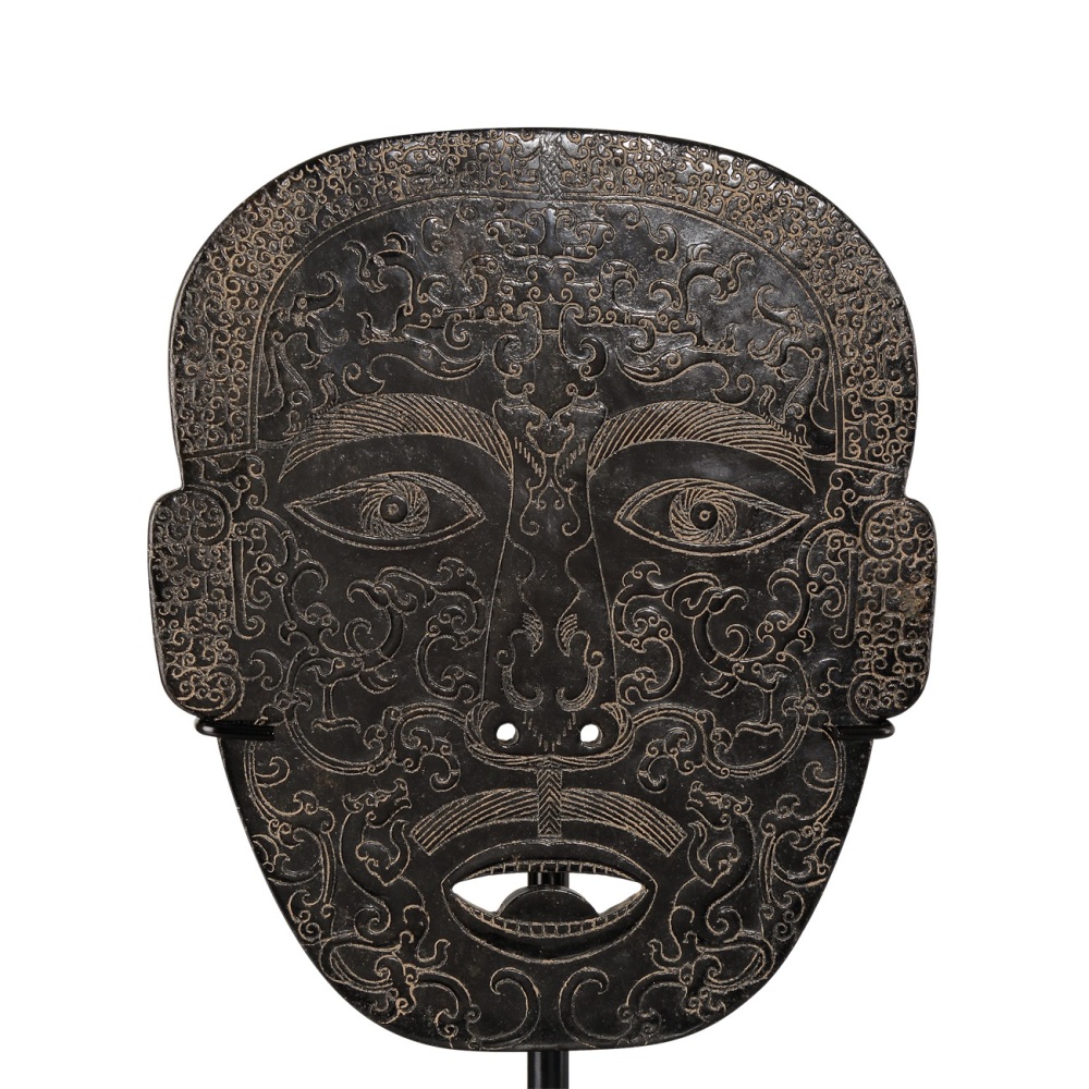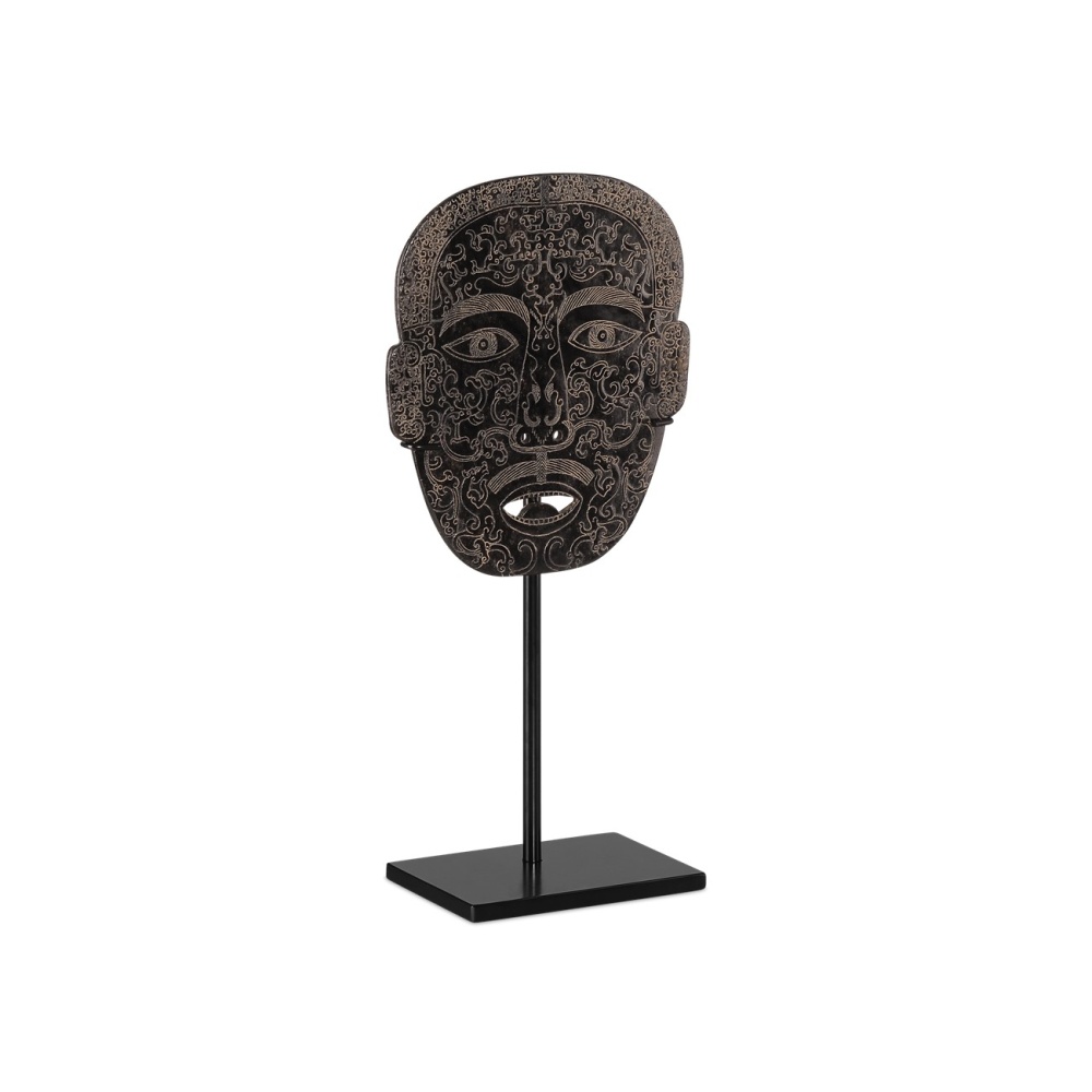The Han Dynasty Jade Medicine Mask, which is made of a bronze-colored stoneware, emulates a famed jade carving and sits atop a metal stand in a black finish. During the bygone era for which it is named, a mask like this would be placed on the chest of doctors and healers during medical treatments because it was thought to ward off evil spirits. The rich brown sculpture is carved on the front and the back.