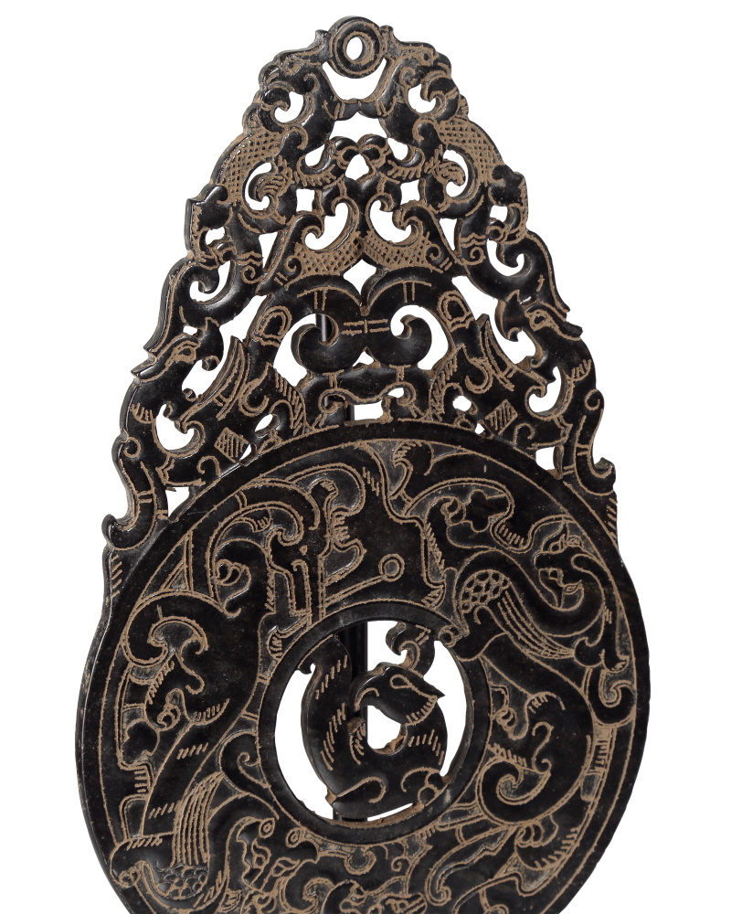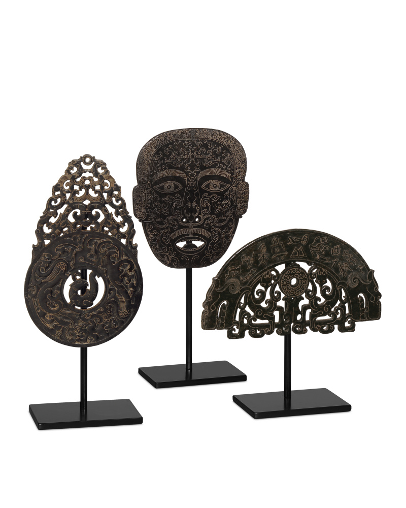 The Han Dynasty Jade Symbol, which is made of a bronze-colored stoneware, emulates a famed jade carving and sits atop a metal stand in a black finish. The profile is called a "Bi" because the hole in the center represents the sky and the heavens beyond it. The name of this rich brown sculpture reflects that it is made in a Han Dynasty style, and it is carved on the front and the back.