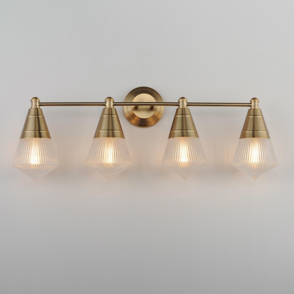 A prismatic diffusion of light is housed within pressed cone glass shades. Choose from pendants with tapered metal halves that conceal the light source or glass shades that are supported by a metal ring. Coordinating bath vanity lights complete the collect