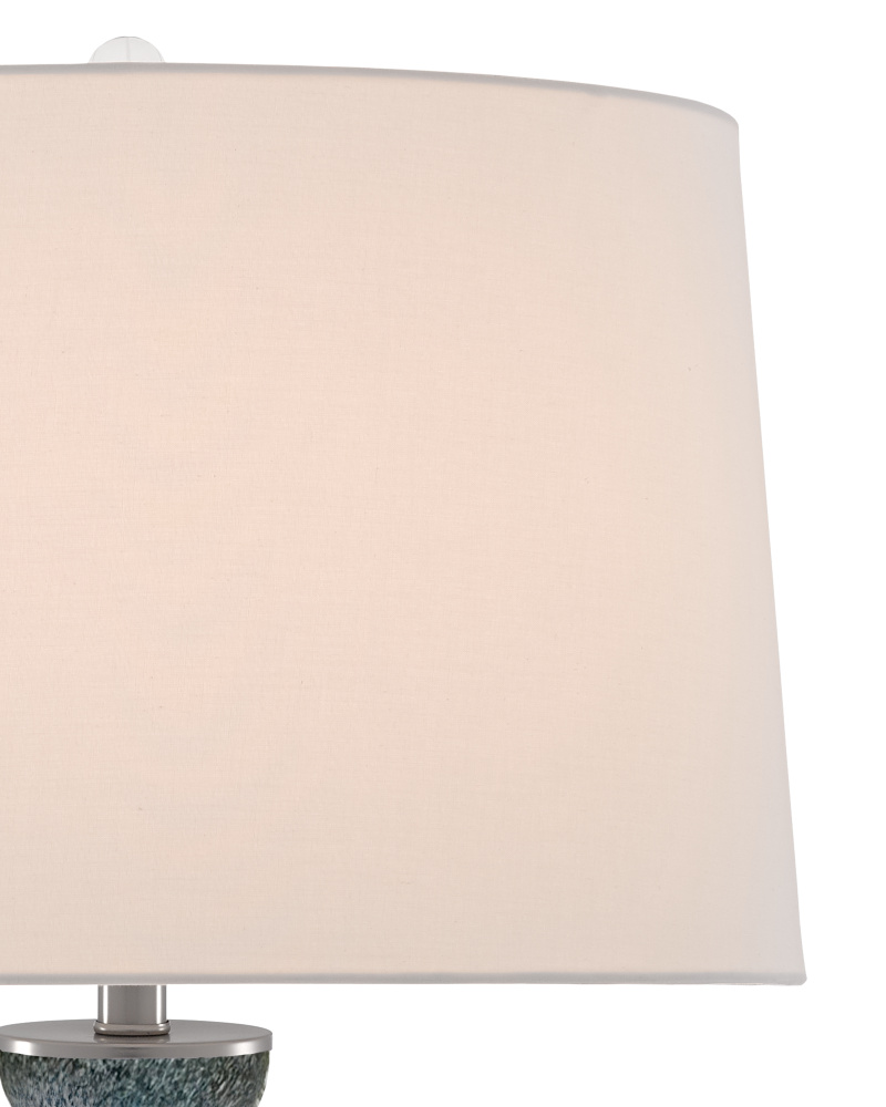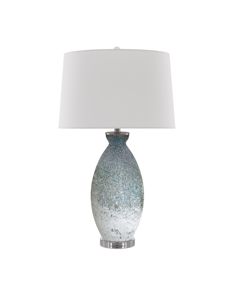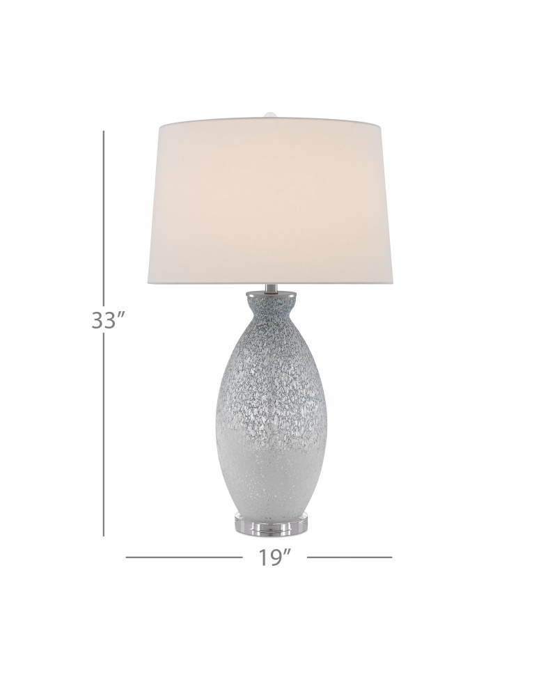 Like the moon rising out of fog, the body of our Hatira Table Lamp has a mysterious patterning on the clear glass body hand-applied in pale blue and white. We placed the pale blue lamp on an optical crystal base and topped it with an oversized off-white linen drum shade.
