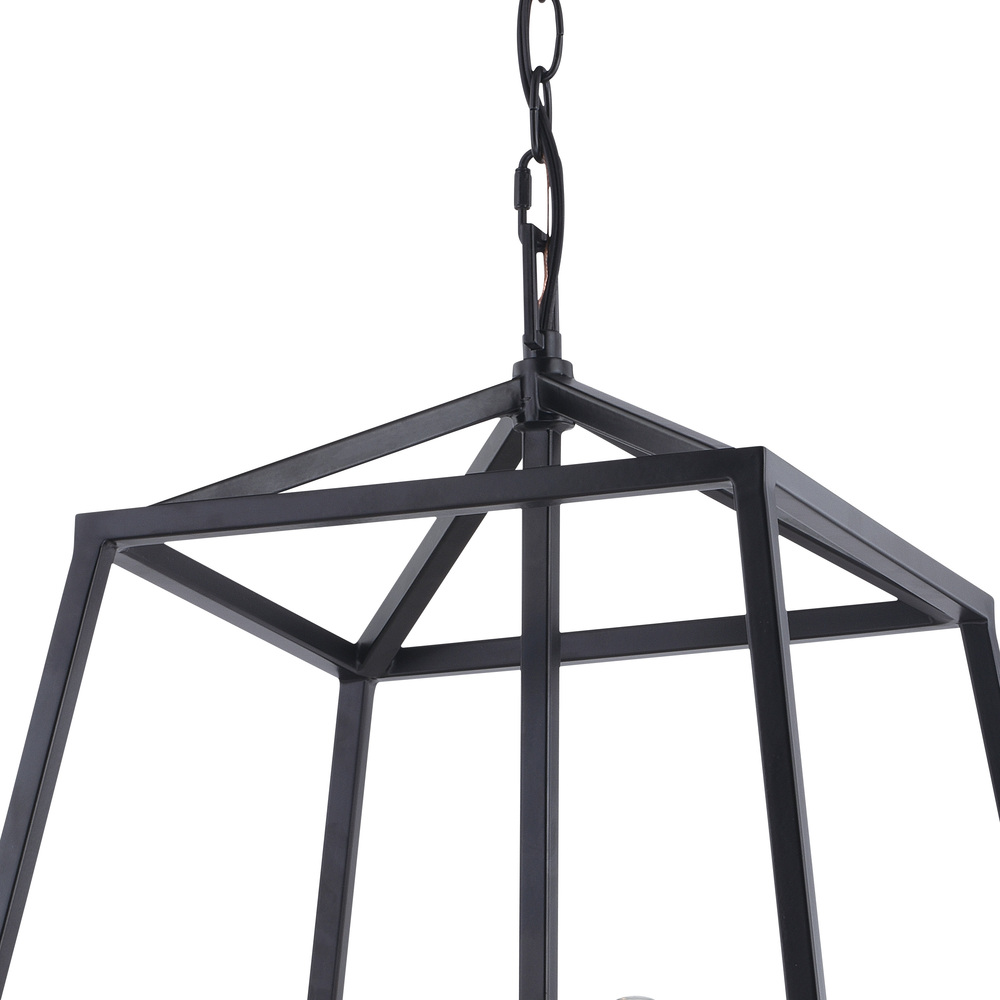 An open cage design and exposed light source define the Hayes pendant collection. Strong geometric lines finished in black surround vintage Edison style filament bulbs to complete the look. The open cage design means there is no glass to clean or fog up. Install these lantern pendants individually or in a group; ideal for kitchens, dining areas, or bar areas. Use this damp rated ceiling light indoors or outdoors; ideal for your covered porch, entryway, or any other area of your home.