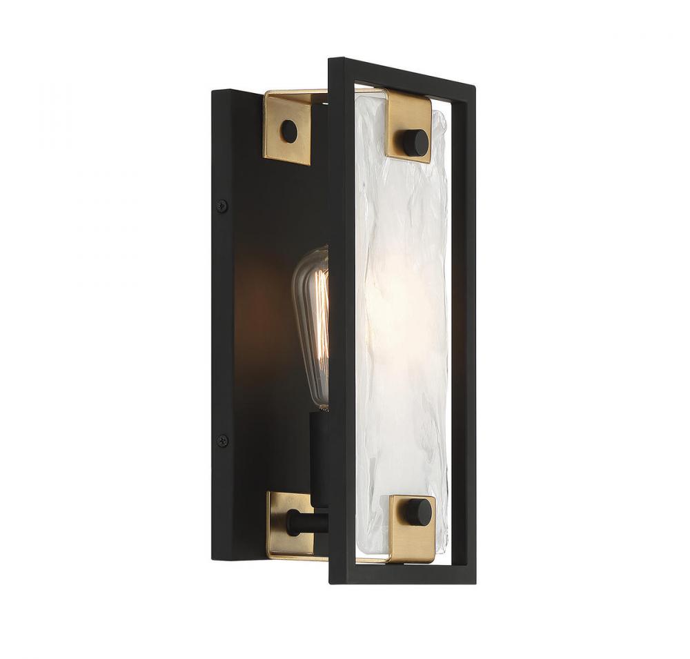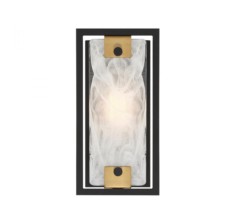 Swirling, mesmerizing strie piastra glass frames the light within the Savoy House Hayward 1-light sconce. The matte black frame showcases warm brass accents for another dimension of style. Hayward is 12" in height, 6" in width and extends 4.5" from the wall. It uses one standard size bulb of up to 60 watts per bulb.
