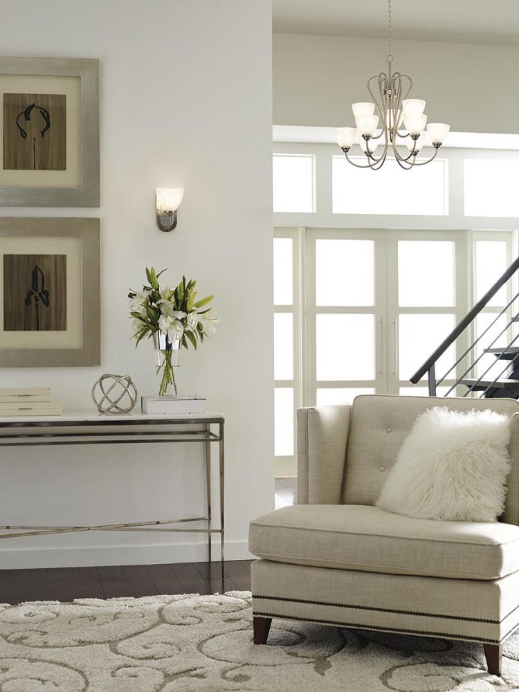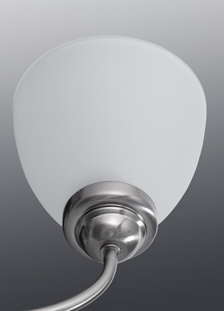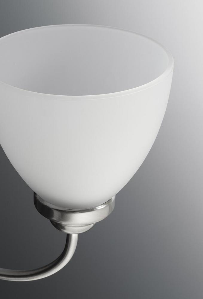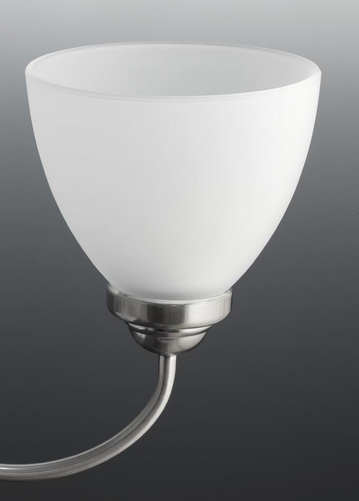 Brushed Nickel finish.;Etched glass shades provide satisfying illumination.;Arching angles take on the name of the Heart Collection.;Chain is provided to allow the fixture to hang straight and level.