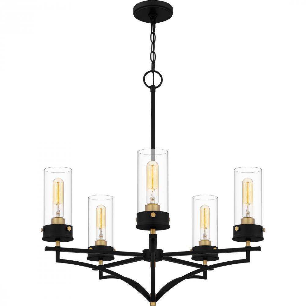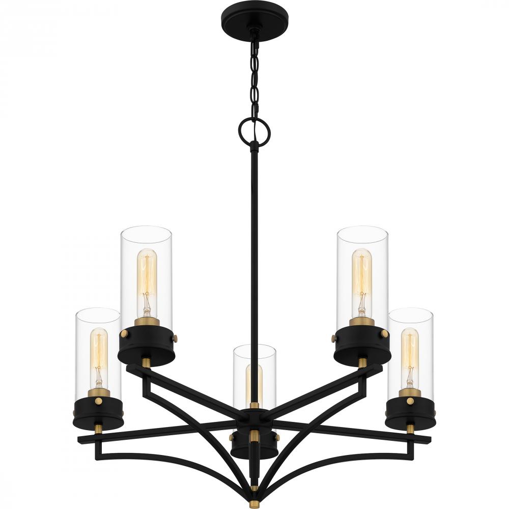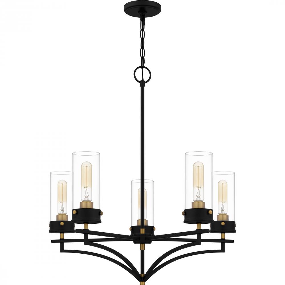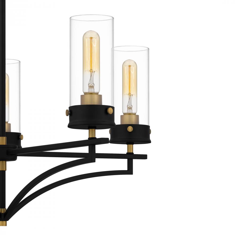 Hillside spotlights modern industrial style. Thin matte black arms are accentuated by clear glass shades and warm brass accents, adding a striking contrast to the clean lines and geometric silhouette. The Hillside chandelier is available in two sizes to ea