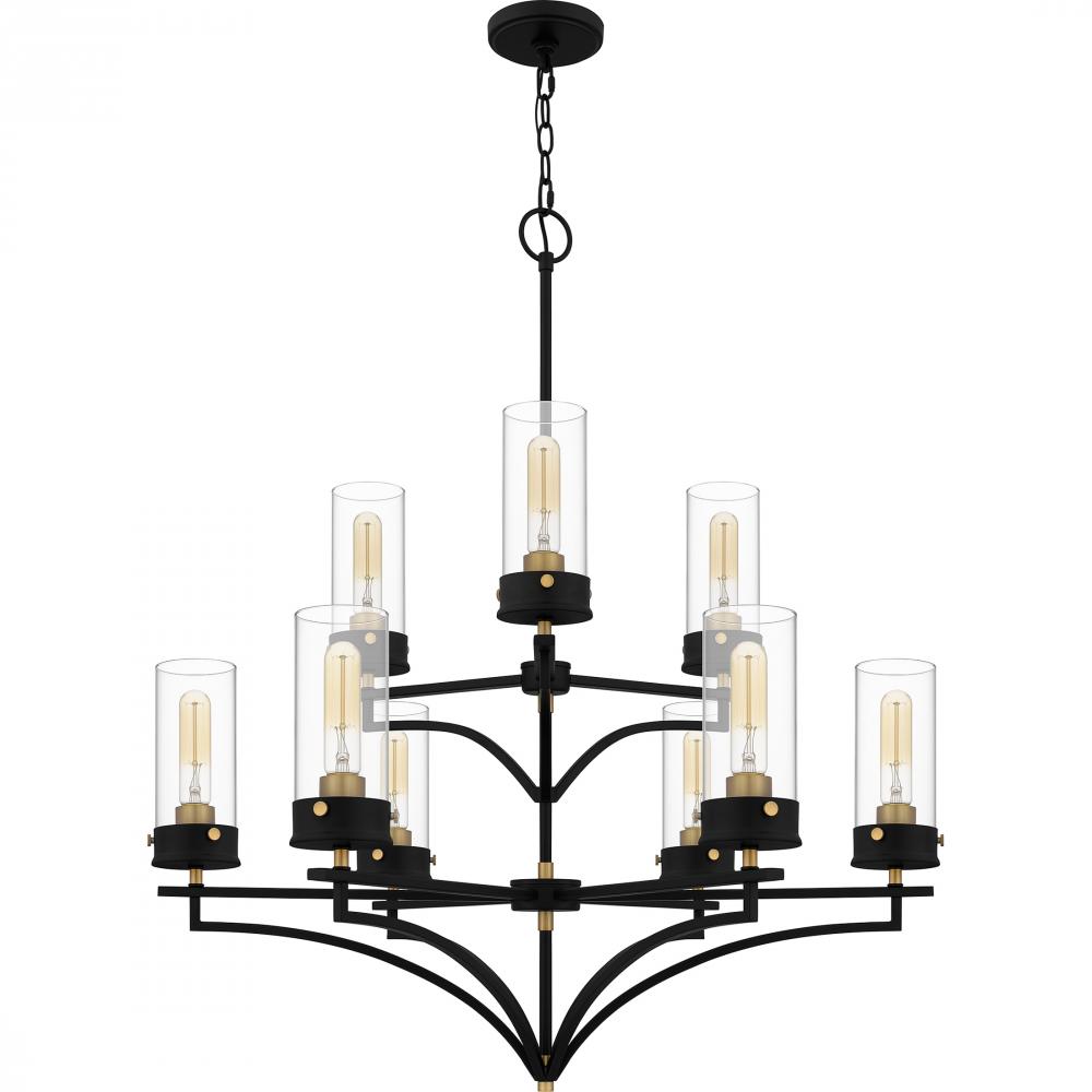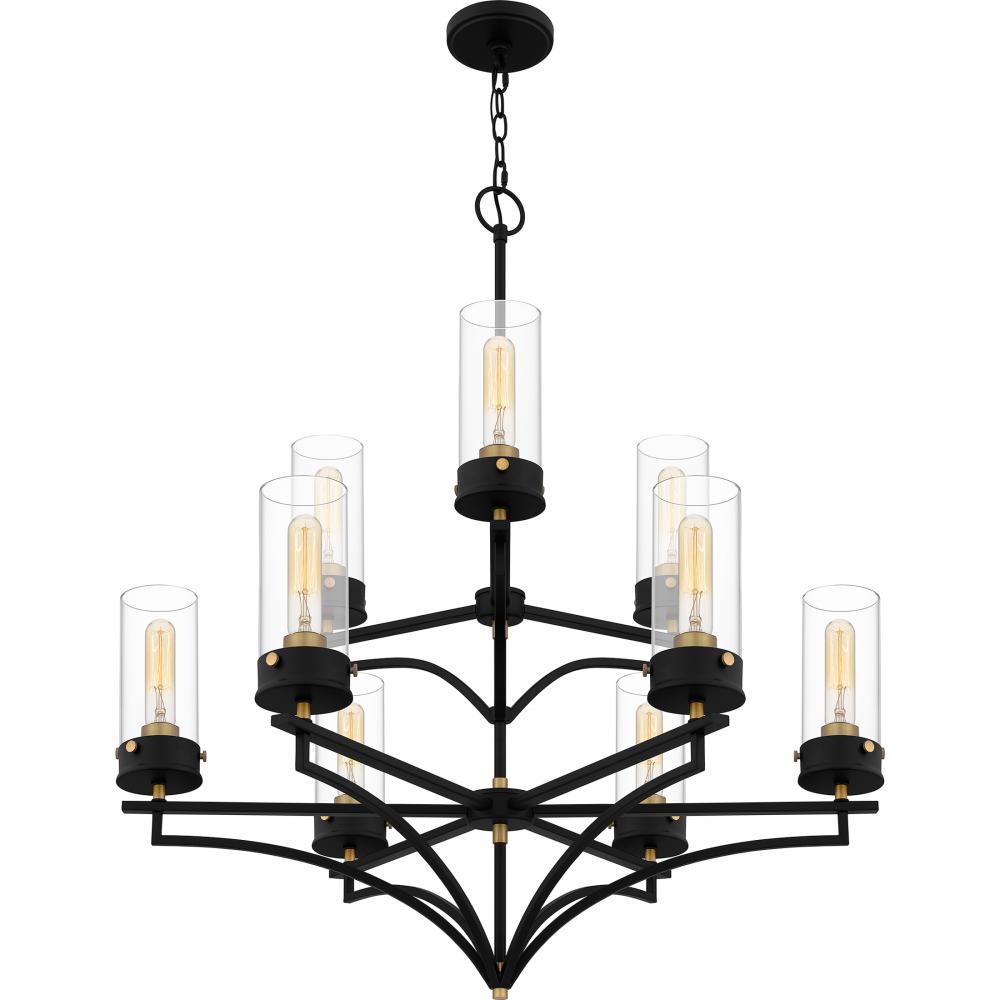 Hillside spotlights modern industrial style. Thin matte black arms are accentuated by clear glass shades and warm brass accents, adding a striking contrast to the clean lines and geometric silhouette. The Hillside chandelier is available in two sizes to ea