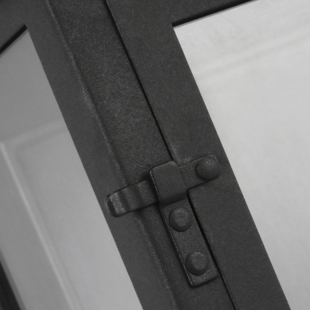 The Hingham outdoor family by Chapman & Myers is crafted of steel with a clear glass front, textured black finish and black candle tubes. Available in three size options .