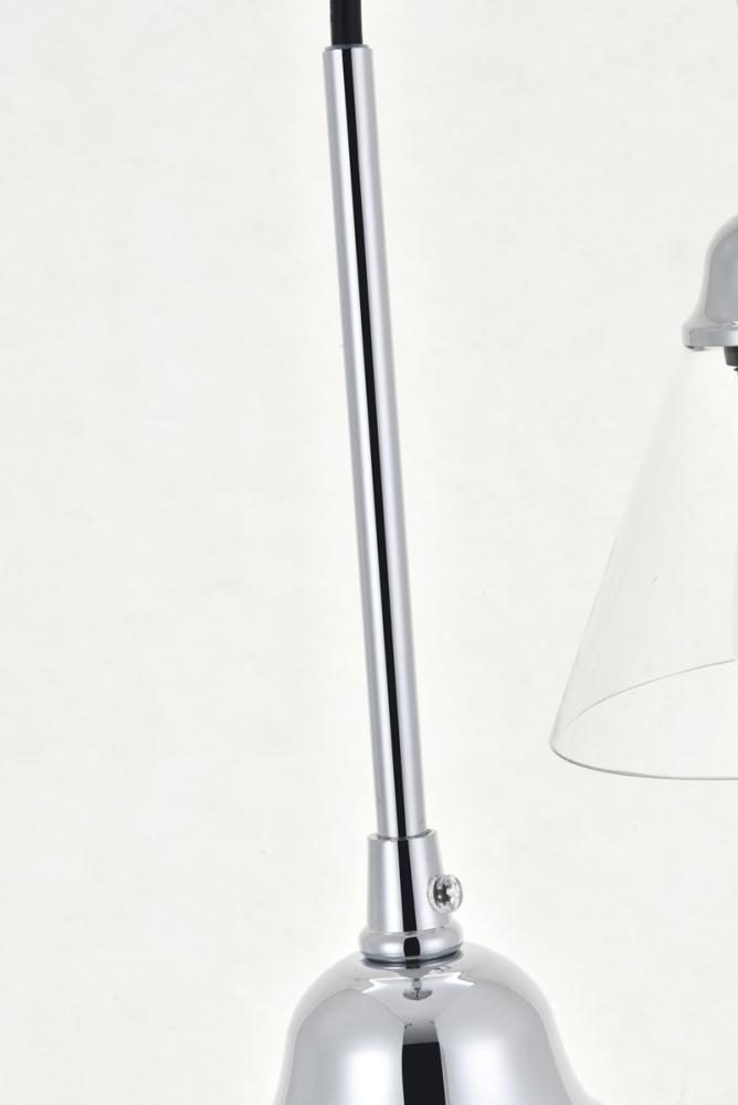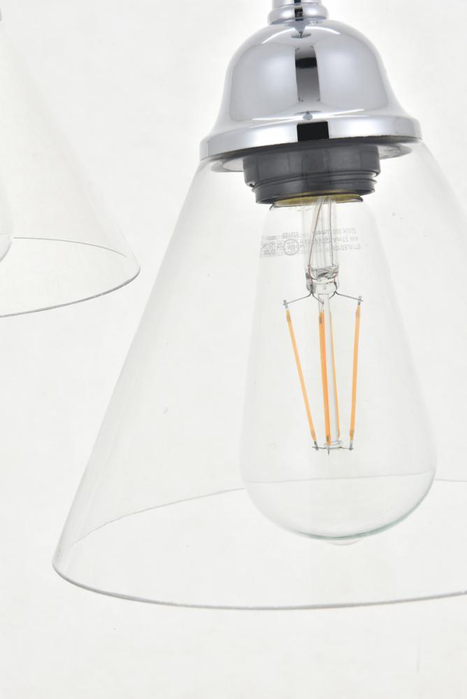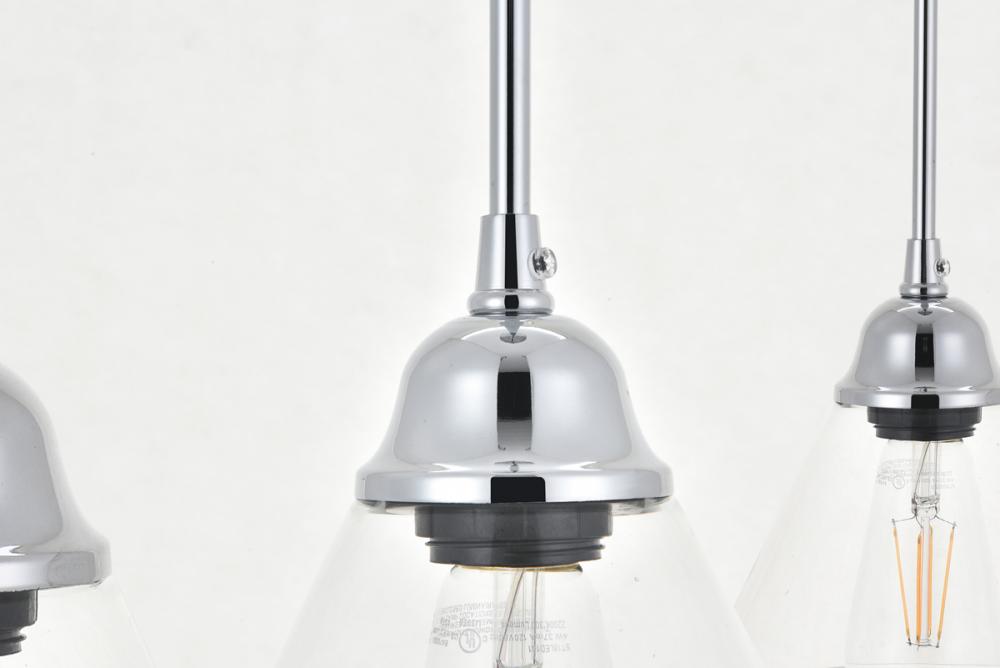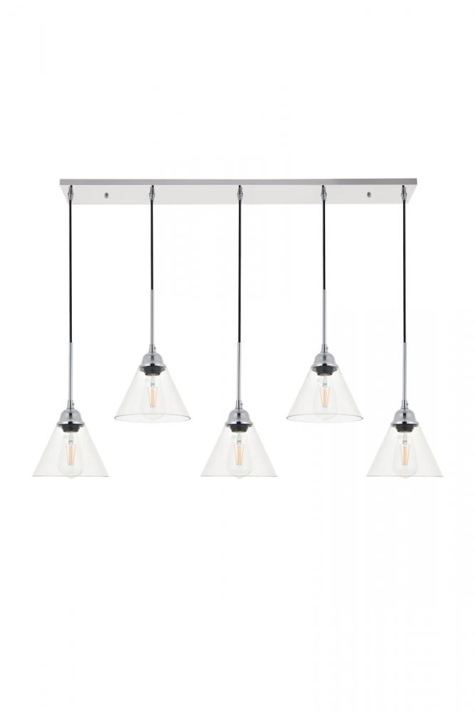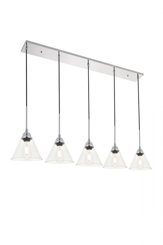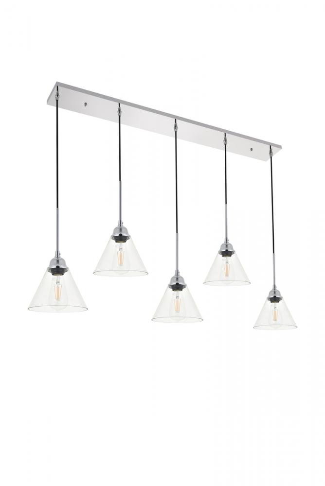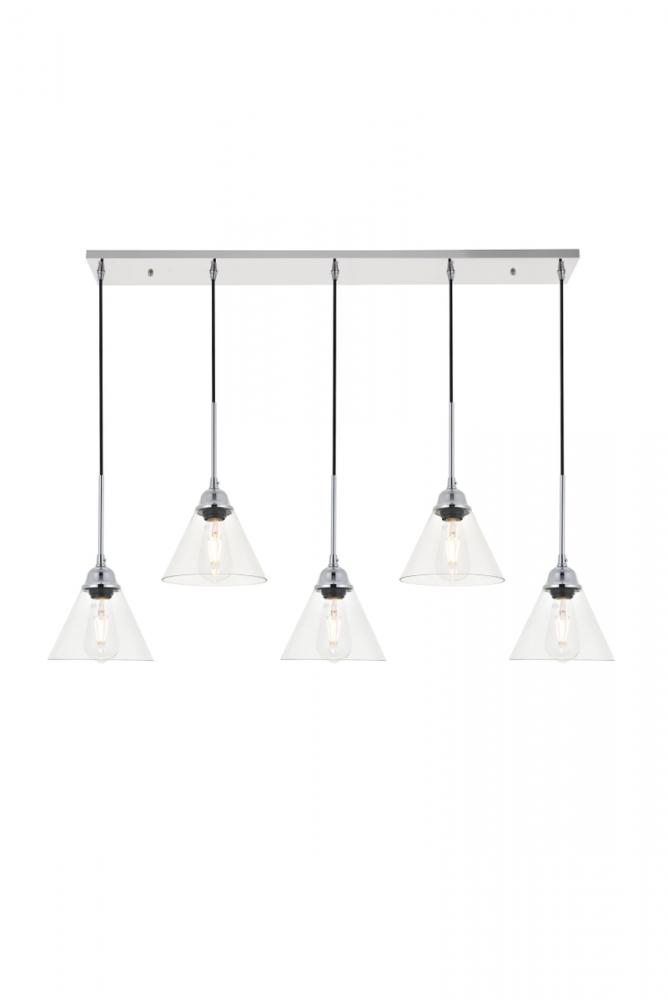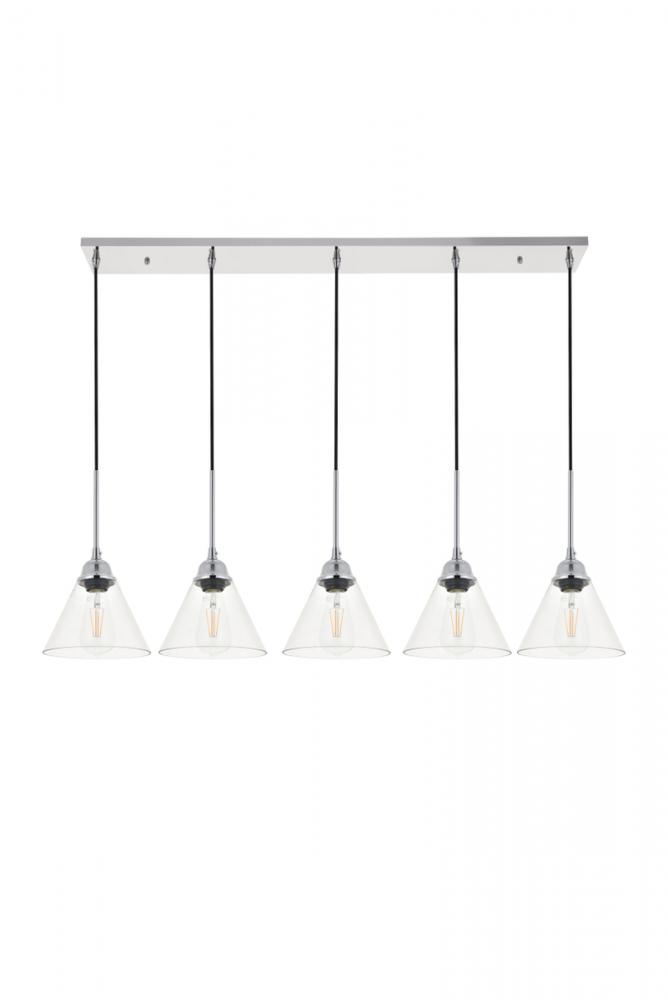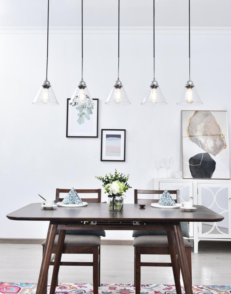 Take a step back through time with the Histoire 5-light pendant lamp in a chrome finish. The ever delightful adjustable cords support the clear glass cone shades while lights illuminate the surrounding area, creating a beautiful display of charm. Hanging 5 in a row, this is the perfect pendant lamp to act as your guide in your foyer or living room, or even to light up your bathroom walls, you will always enjoy its captivating light.