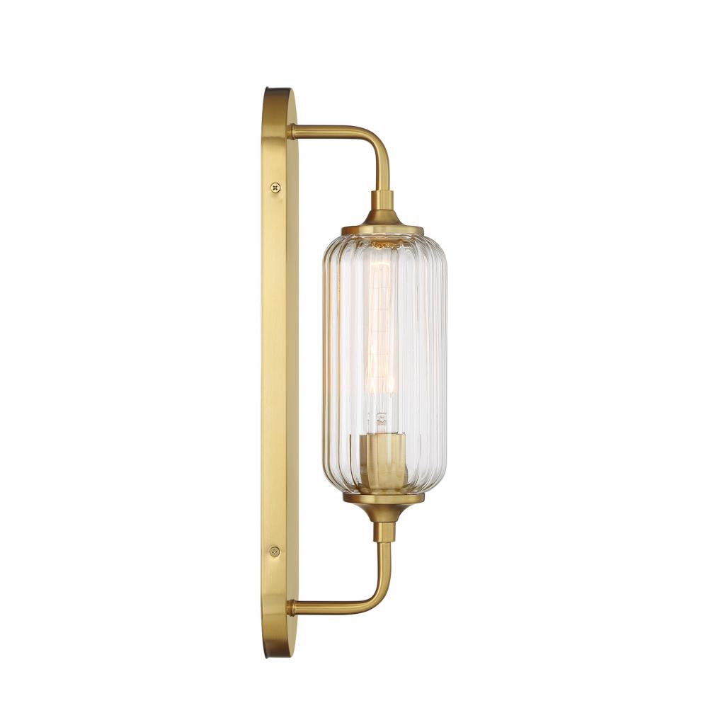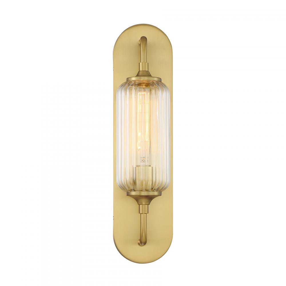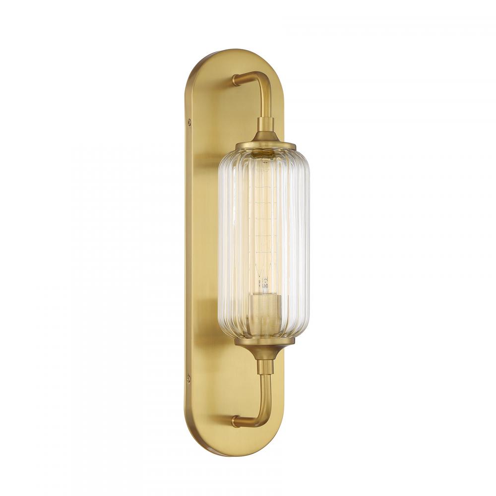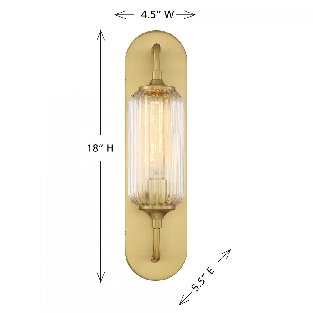 The Savoy House Holton 1-light sconce showcases an inventive and geometric style with a tall, rounded shade of clear ribbed glass and a slim, rounded structure finished in Warm Brass. It will bring a big dose of style to any space! Holton is 18" in height, 4.5" in width and extends 5.5" from the wall. It uses one standard size bulb of up to 60 watts. Bulb not included. This sconce is damp area rated.