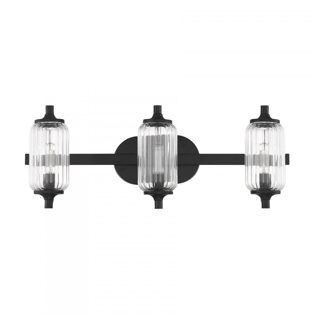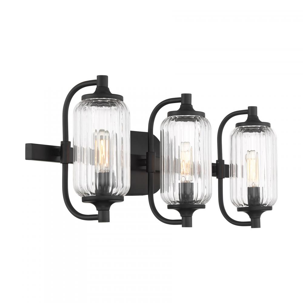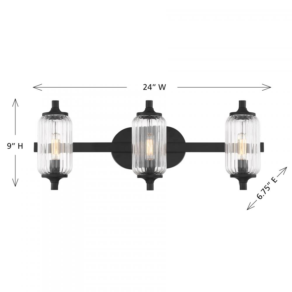 The Savoy House Holton 3-light bath light showcases an inventive and geometric style with tall, rounded shades of clear ribbed glass and a slim, rounded structure finished in Black. It will bring a big dose of style to any bathroom! Holton is 9" in height, 24" in width and extends 6.75" from the wall. It uses three candelabra size bulbs of up to 60 watts per bulb. Bulbs not included. Install as shown. This bath bar is damp area rated.
