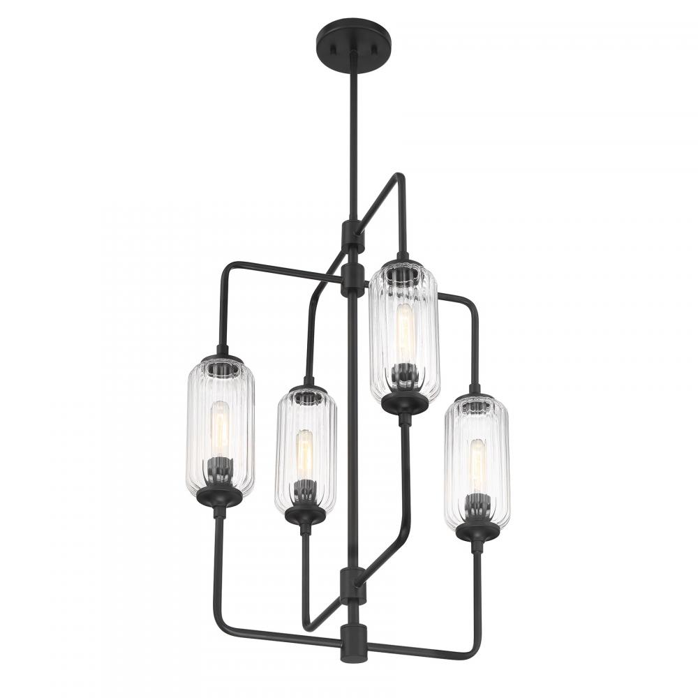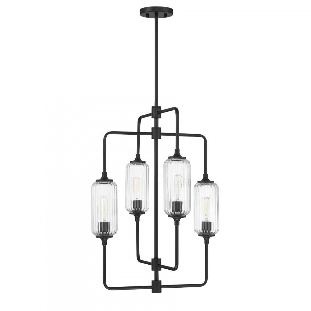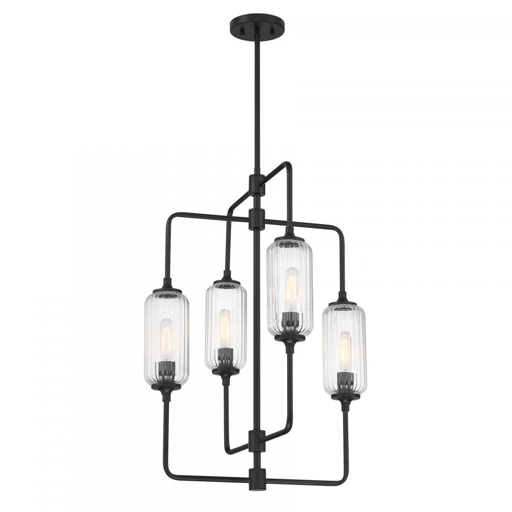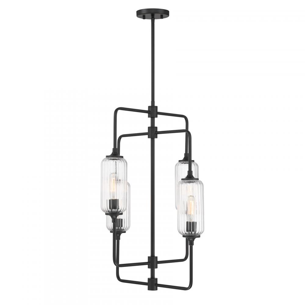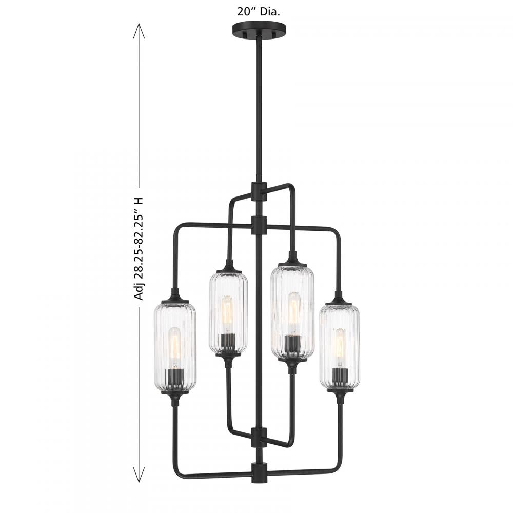 The Savoy House Holton 4-light foyer light showcases an inventive and geometric style with tall, rounded shades of clear ribbed glass and a slim, rounded structure finished in Matte Black. It will bring a big dose of style to any space! Holton is 20" in width and has an adjustable height ranging from 28.25" to 82.25". It uses four standard size bulbs of up to 60 watts per bulb. Bulbs not included. Comes with four 12" downrods and one 6" downrod.
