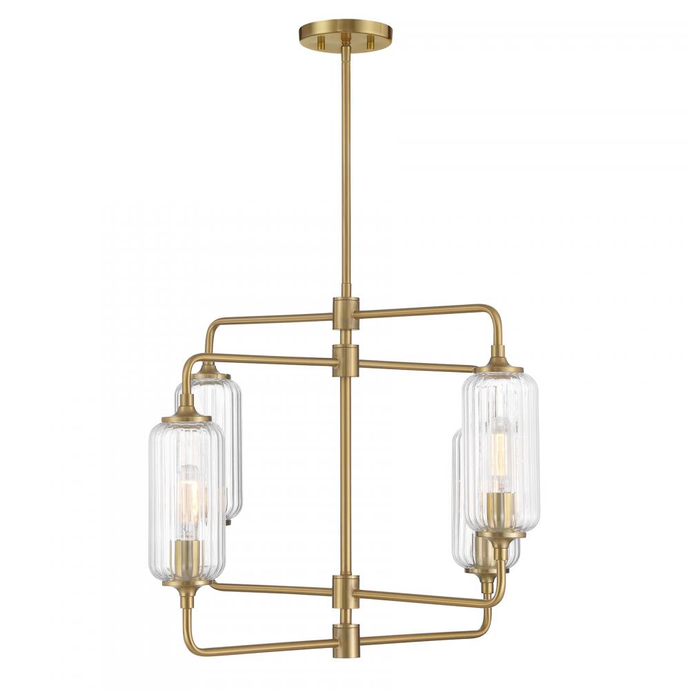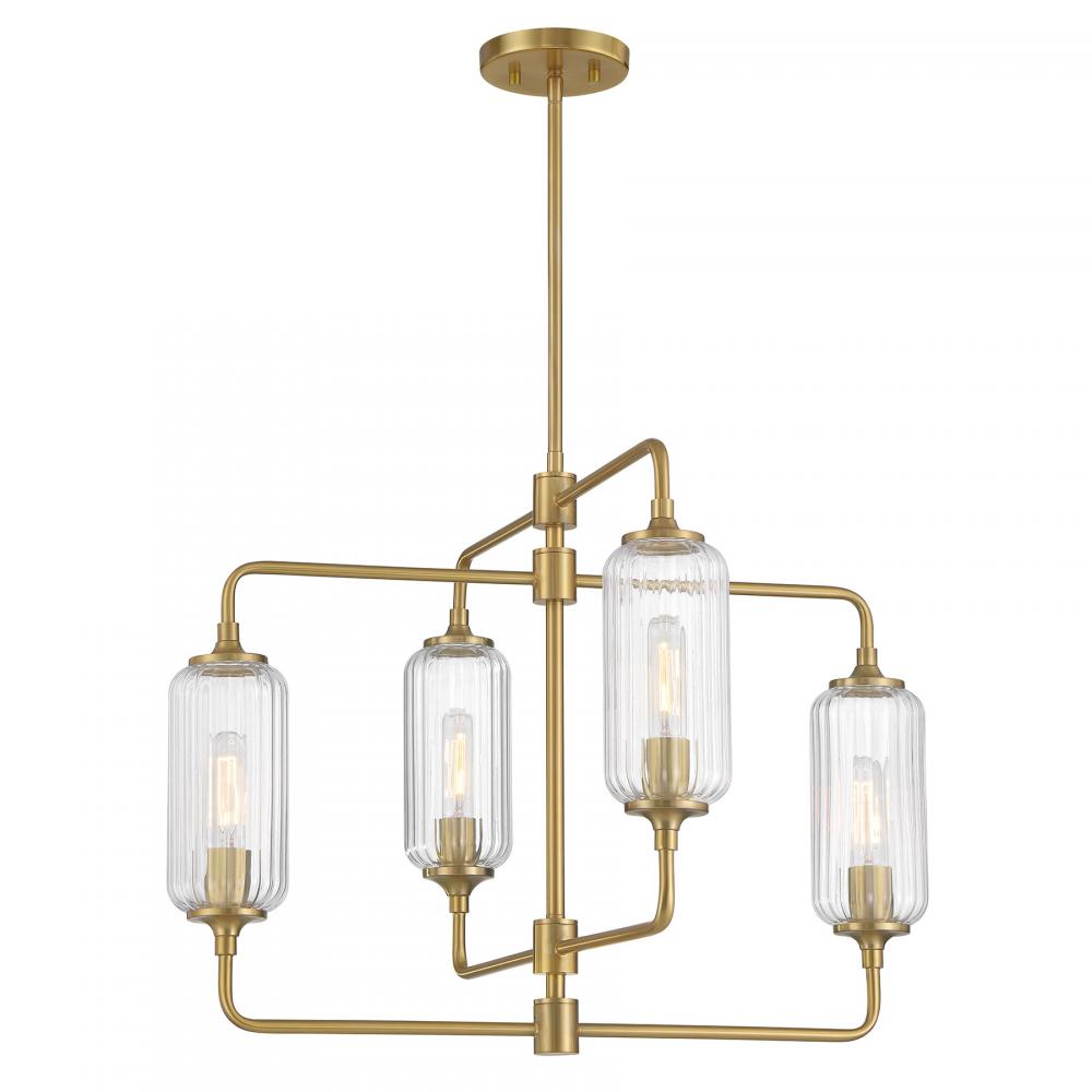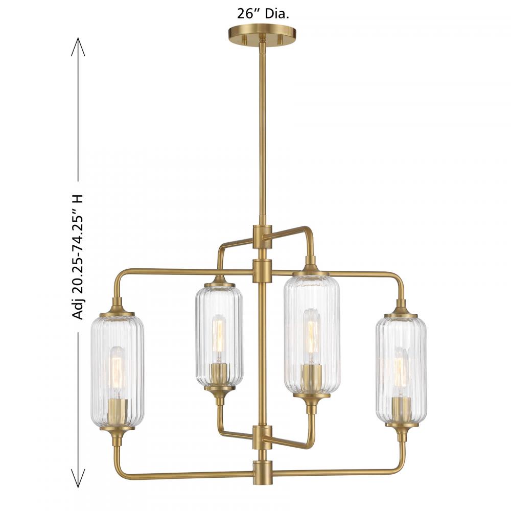 The Savoy House Holton 4-light chandelier showcases an inventive and geometric style with tall, rounded shades of clear ribbed glass and a slim, rounded structure finished in Warm Brass. It will bring a big dose of style to any space! Holton is 26" in width and has an adjustable height ranging from 20.25" to 74.25". It uses four standard size bulbs of up to 60 watts per bulb. Bulbs not included. Comes with four 12" downrods and one 6" downrod.